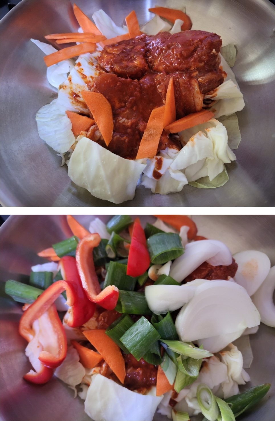 웍에 양배추와 양파 썰어서 넣고 닭갈비양냠육을 넣어서 먼저 익혔(...라고 했으나 ) 그냥 시간관계상 양파, 파프리카, 대파넣고 볶았어요 ㅋ