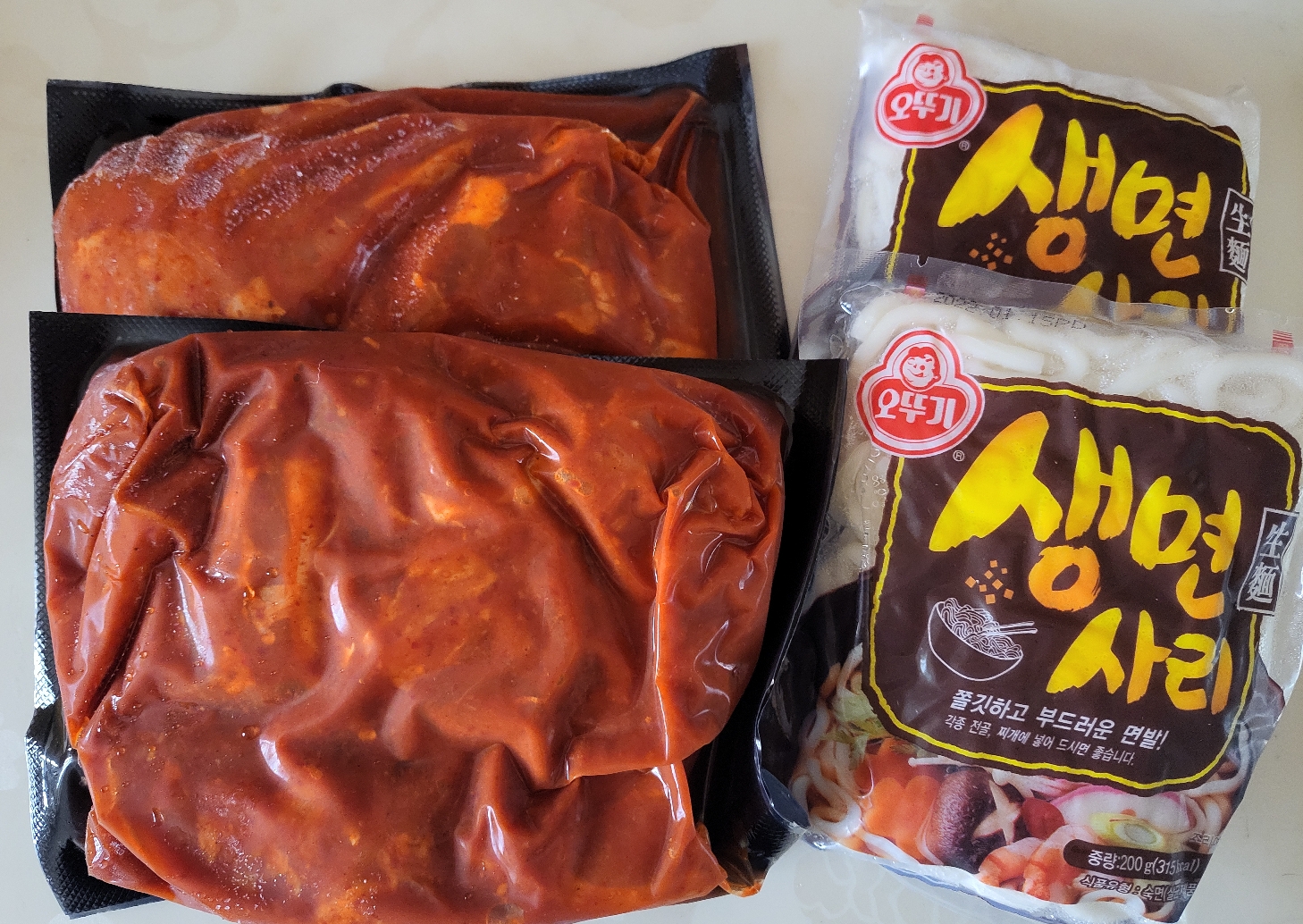 양념닭갈비 2팩, 오뚜기 생면사리2팩 들어있어요.