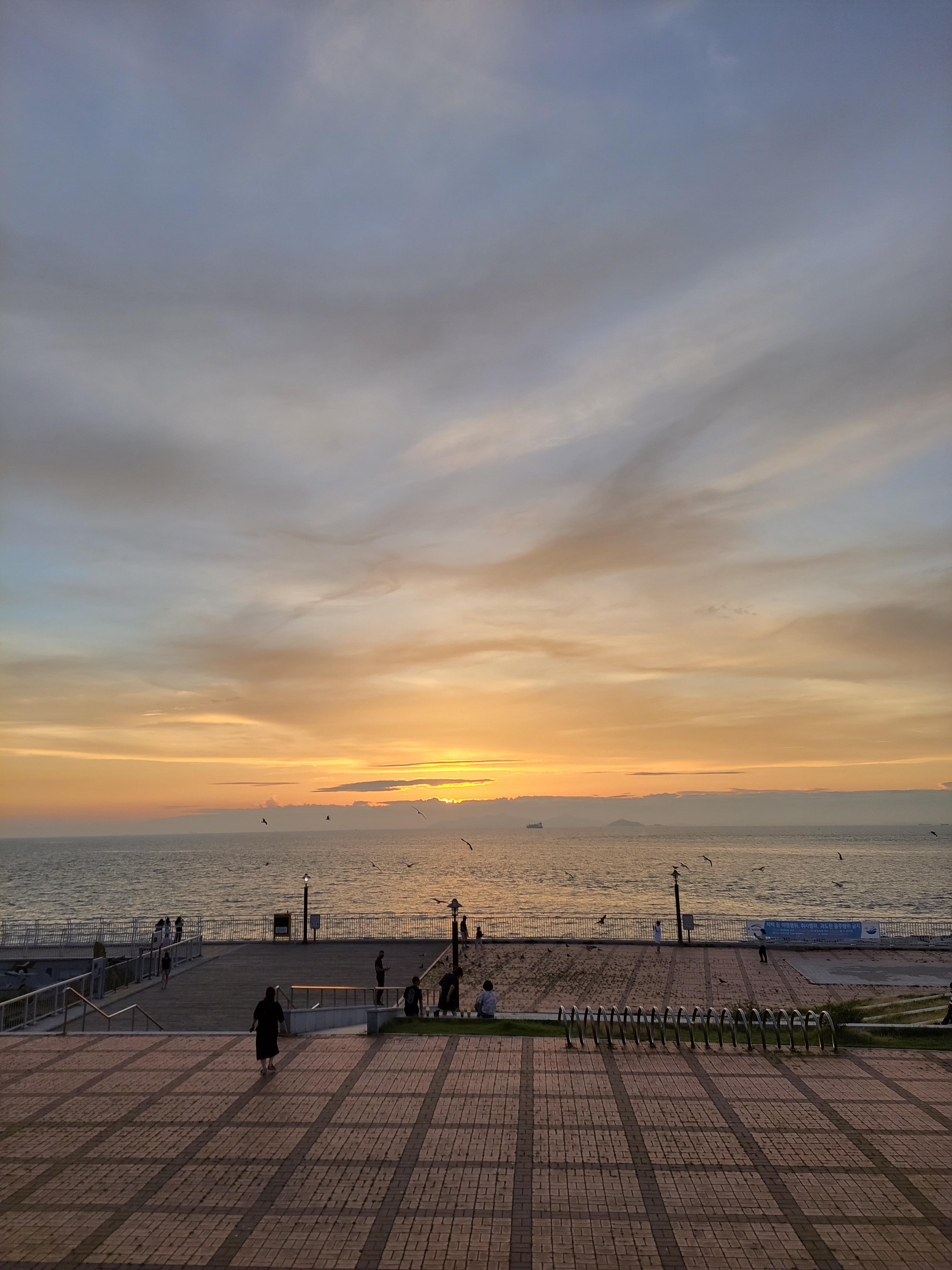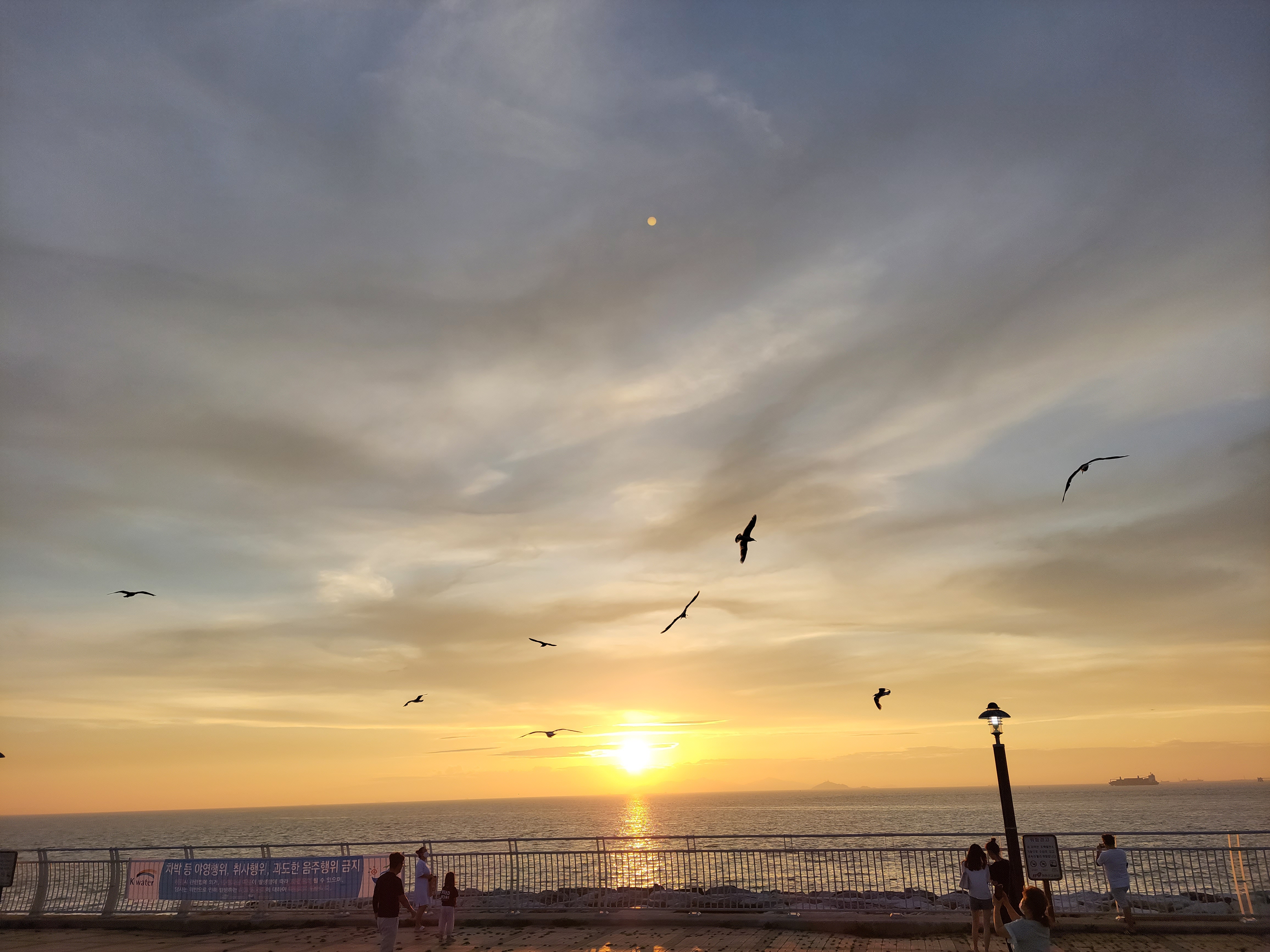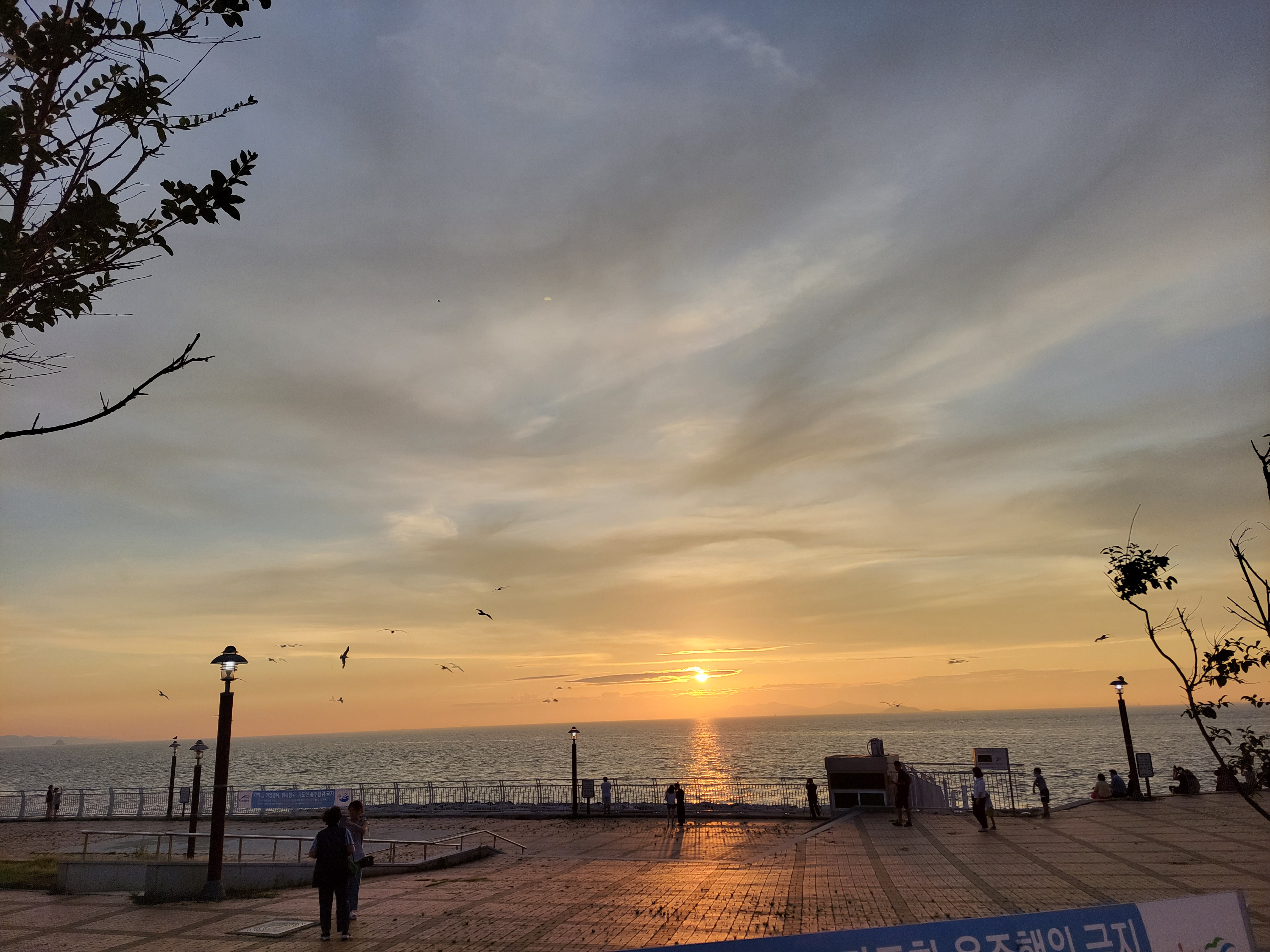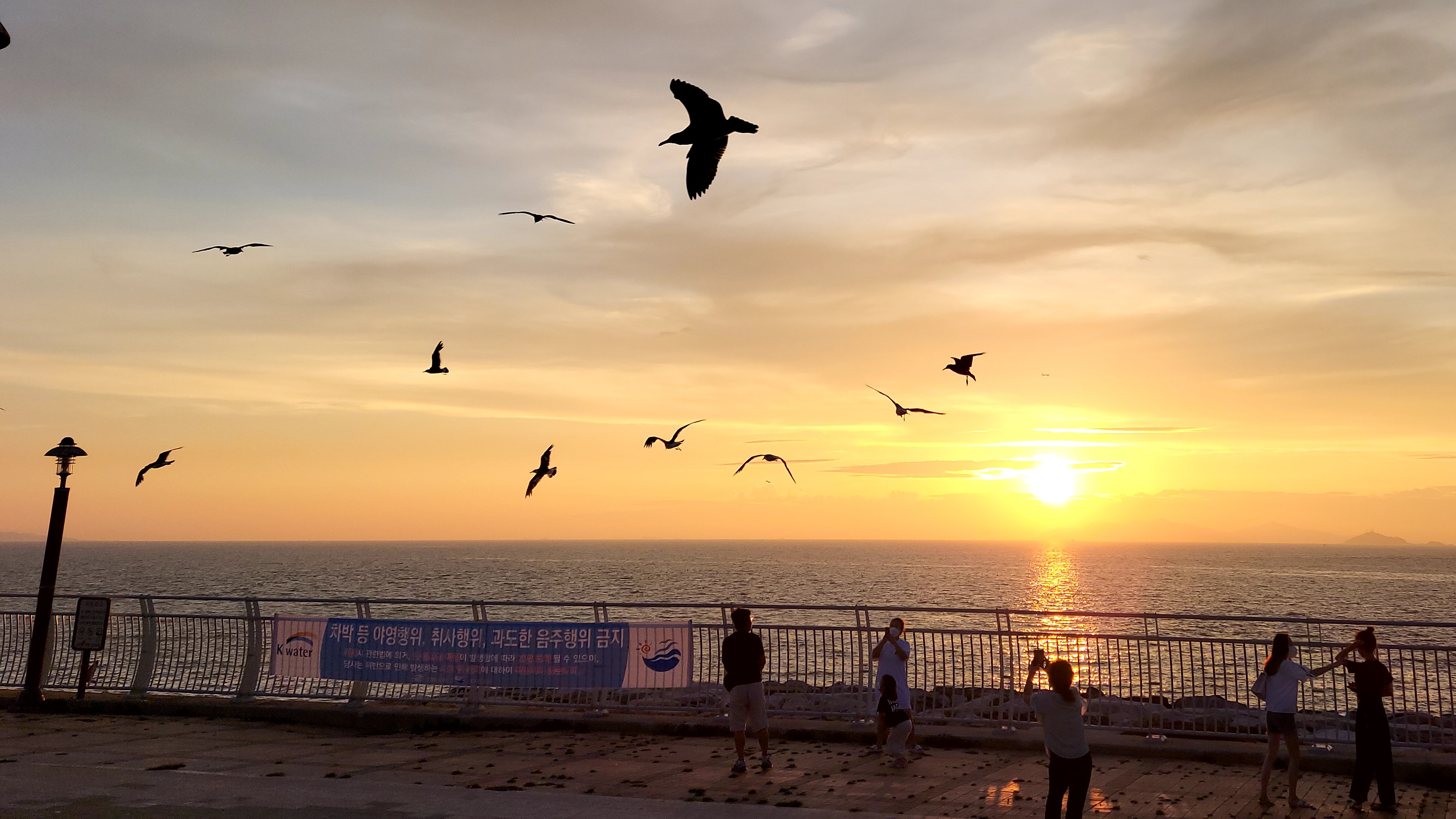 광장앞으로 노을지는 바다풍경, 갈매기들~