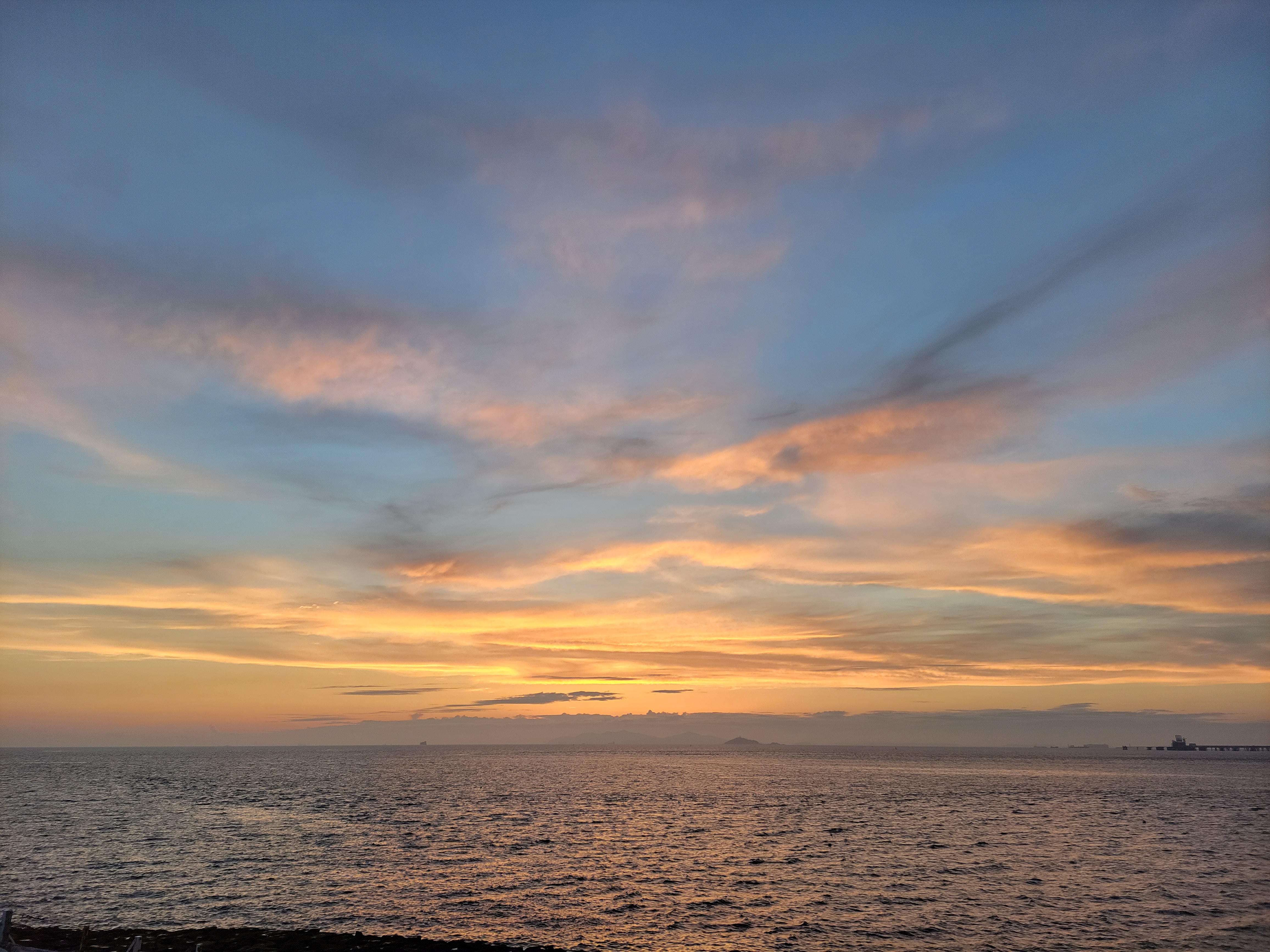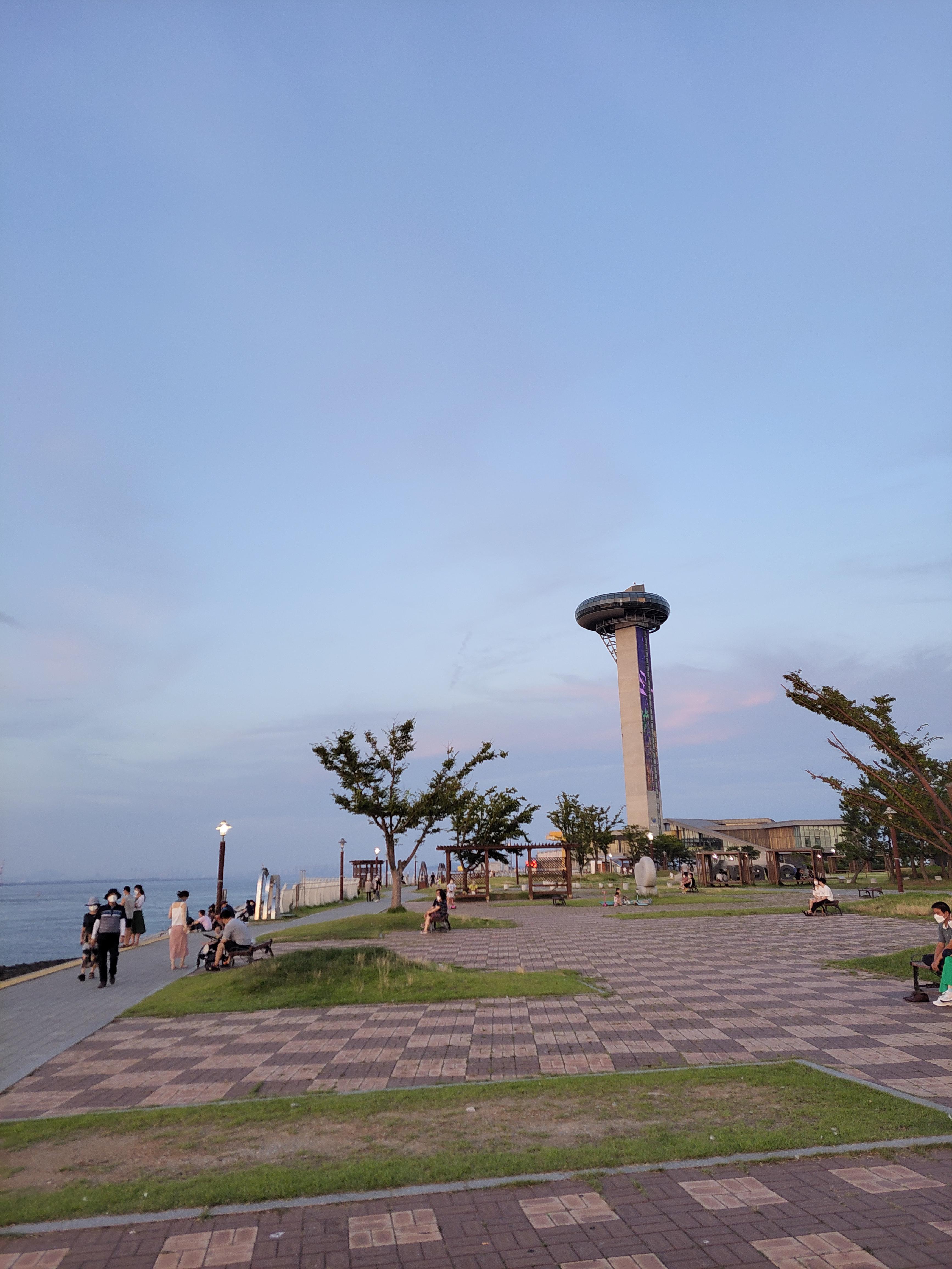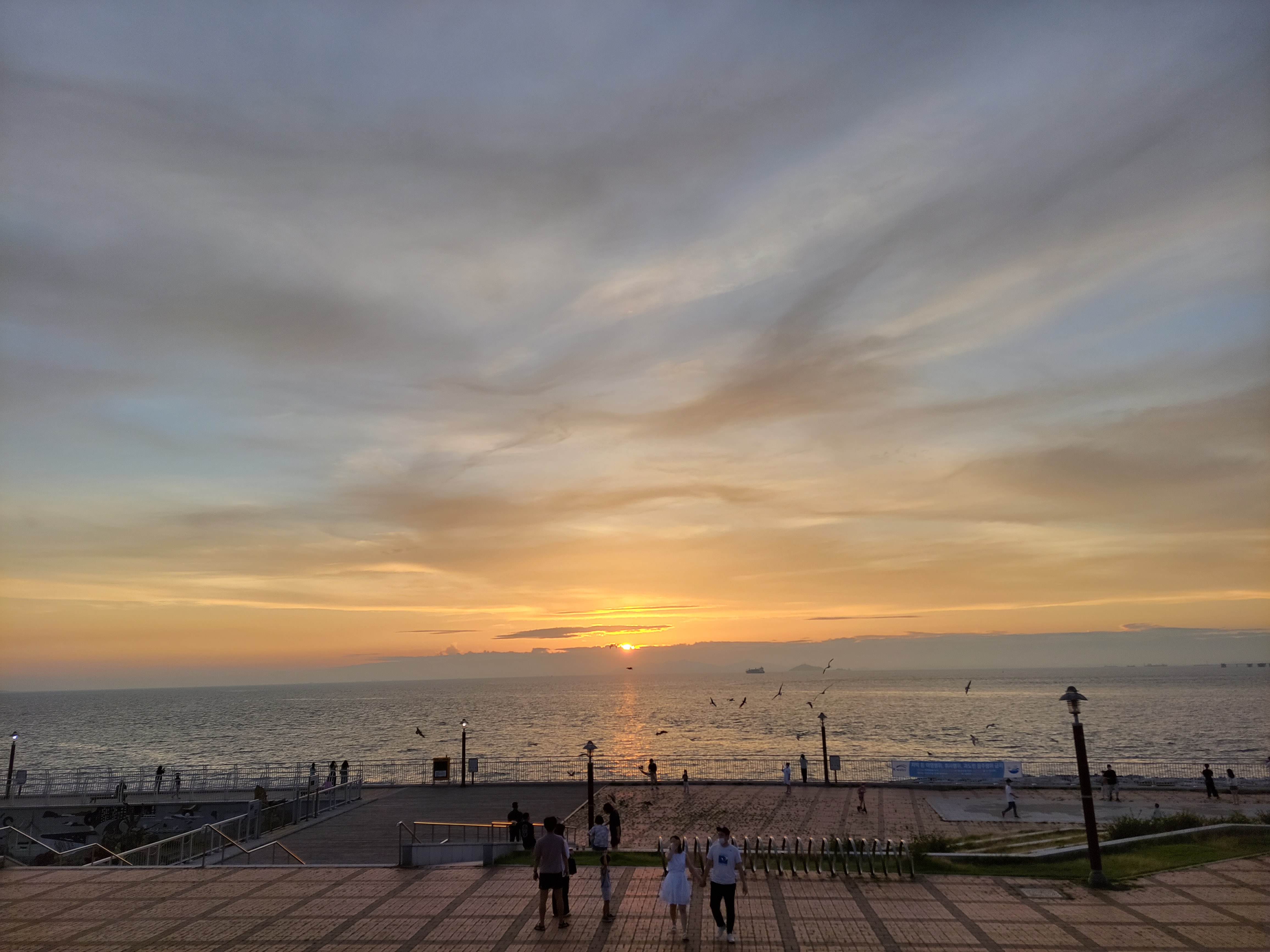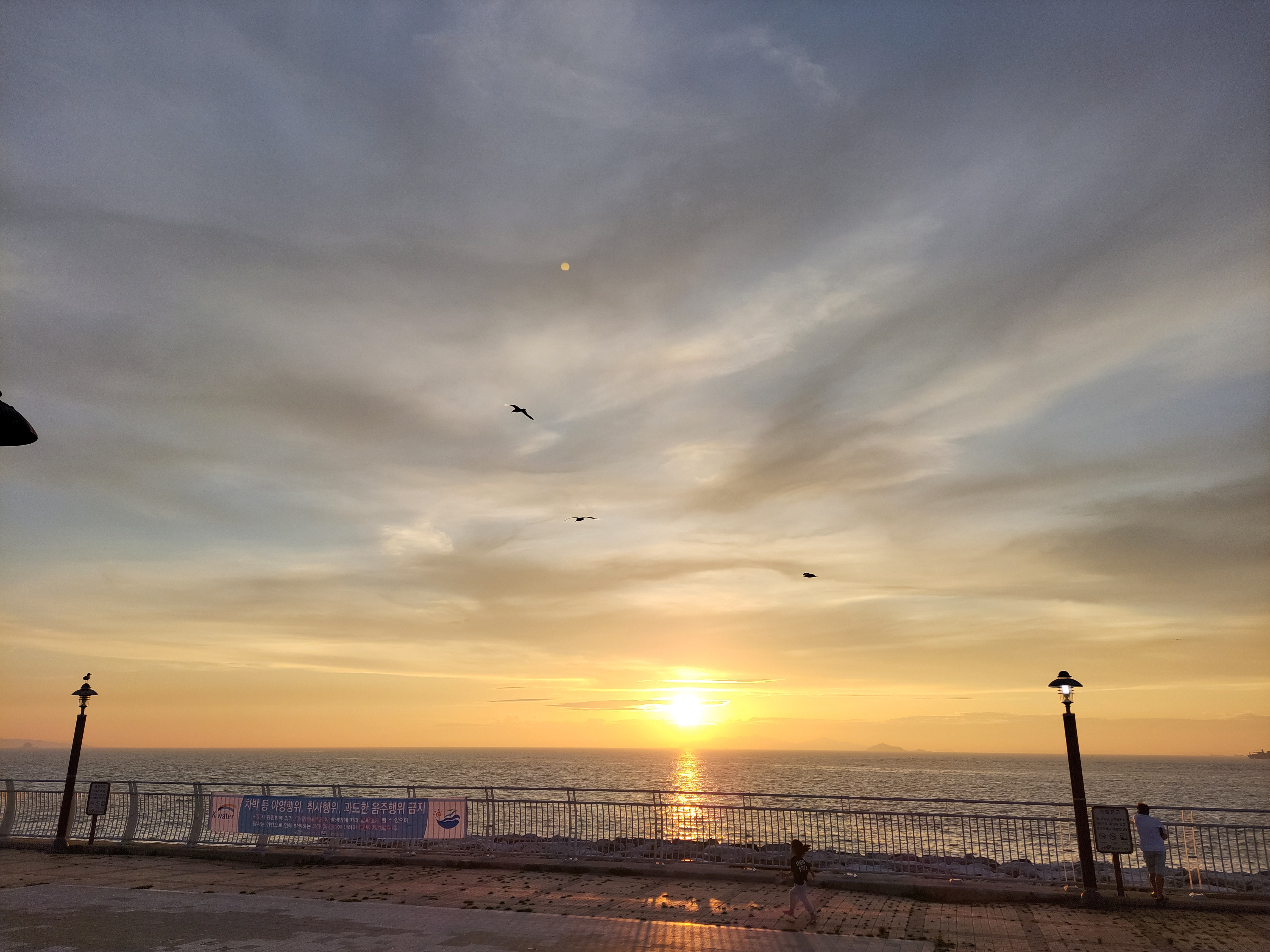광장앞으로 노을지는 바다풍경, 갈매기들~