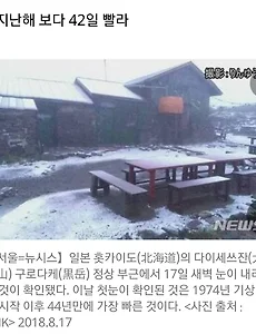 첫눈관측1 와~ 홋카이도 구로다케에 첫눈 관측! 대애박~ 이럴때 위러브유(장길자회장) 클린월드운동 생각난다! 출처 : 뉴시스 이날 첫눈이 확인된 것은 1974년 기상 관측이 시작된 이후 44년만에 가장 빠른 것이다. 구로다케의 로프웨이 운영회사에 따르면 이날 새벽 1시가 조금 못돼 해발 1984m의 정상에서 700m 떨어진 산장 부근에서 관리인이 눈이 내리는 것을 확인했다. 17일 이른 아침 촬영된 이미지도 산장 주위에 희미하게 눈이 쌓여 있는 것을 보여주고 있다. 구로다케에 첫눈이 내린 것은 지난해보다 42일 빠른 것이다. https://news.v.daum.net/v/20180817155042496?f=m 대애박! 지난한 무더위 속에서 말복을 맞이한 어제 오랫만에 시원한 바람을 느껴봤다. 이제 숨좀 쉬고 살만하다 느끼는중인데 일본 홋카이도 구로다케라는 곳에서는 첫눈이 내렸단다~ 애들말로..헐~~ 올해 겨울은.. 2018. 8. 17. 이전 1 다음