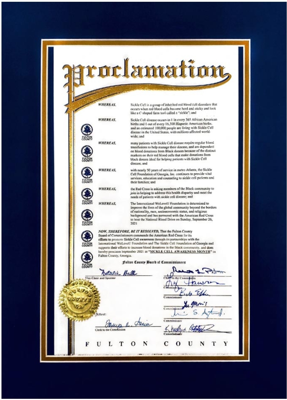 이에, 풀턴카운티위원회는 국제위러브유 및 조지아겸상적혈구재단과 파트너십을 통해 겸상적혈구 인식을 제고하기 위한 미국 적십자사의 노력을 높이 평가하고 헌혈 증가를 위한 그들의 노력을 지원하기로 결정했습니다. 2021년 9월을 조지아주 풀턴카운티의 ‘겸상적혈구병 인식의 달’로 선포합니다.