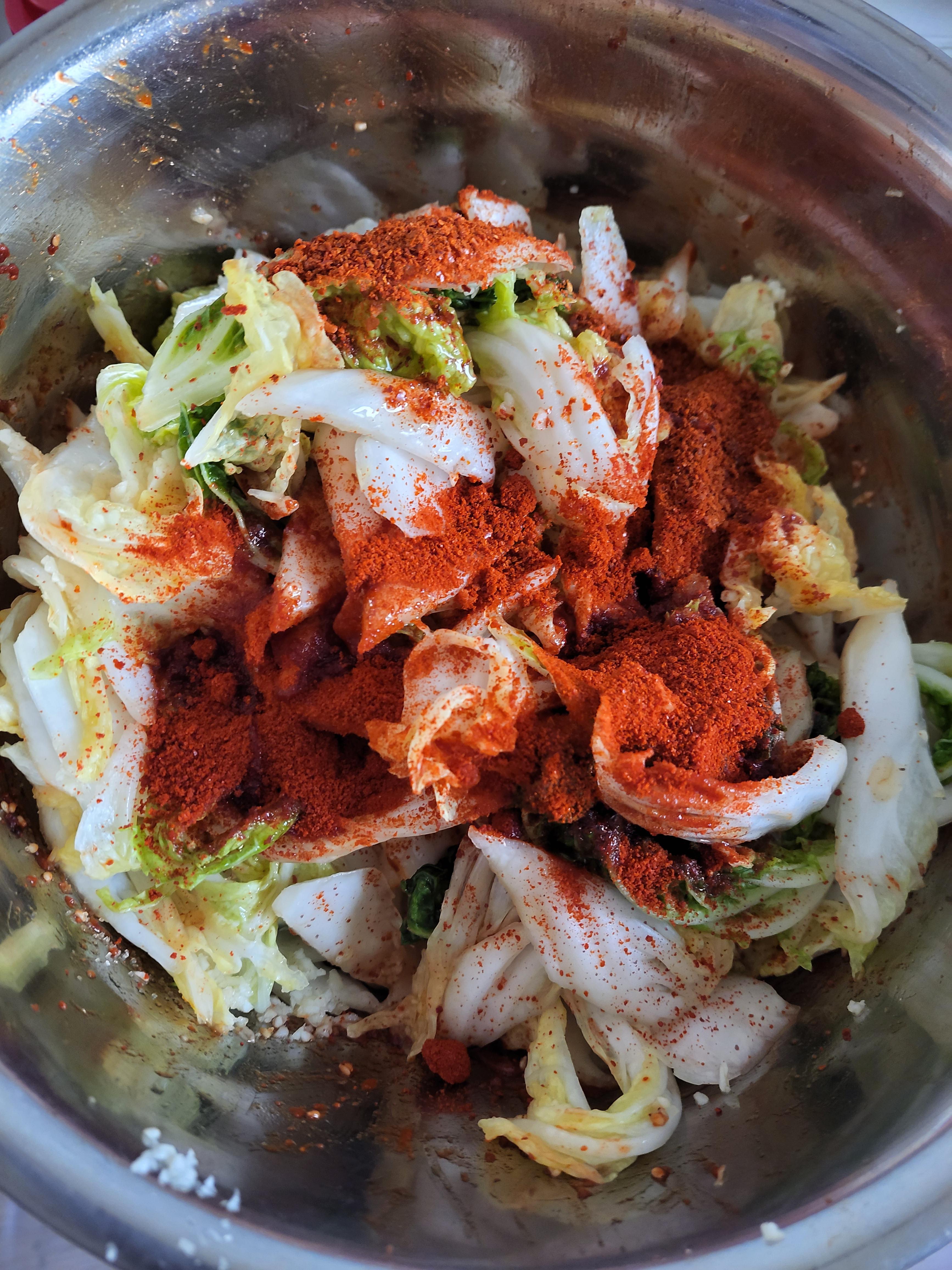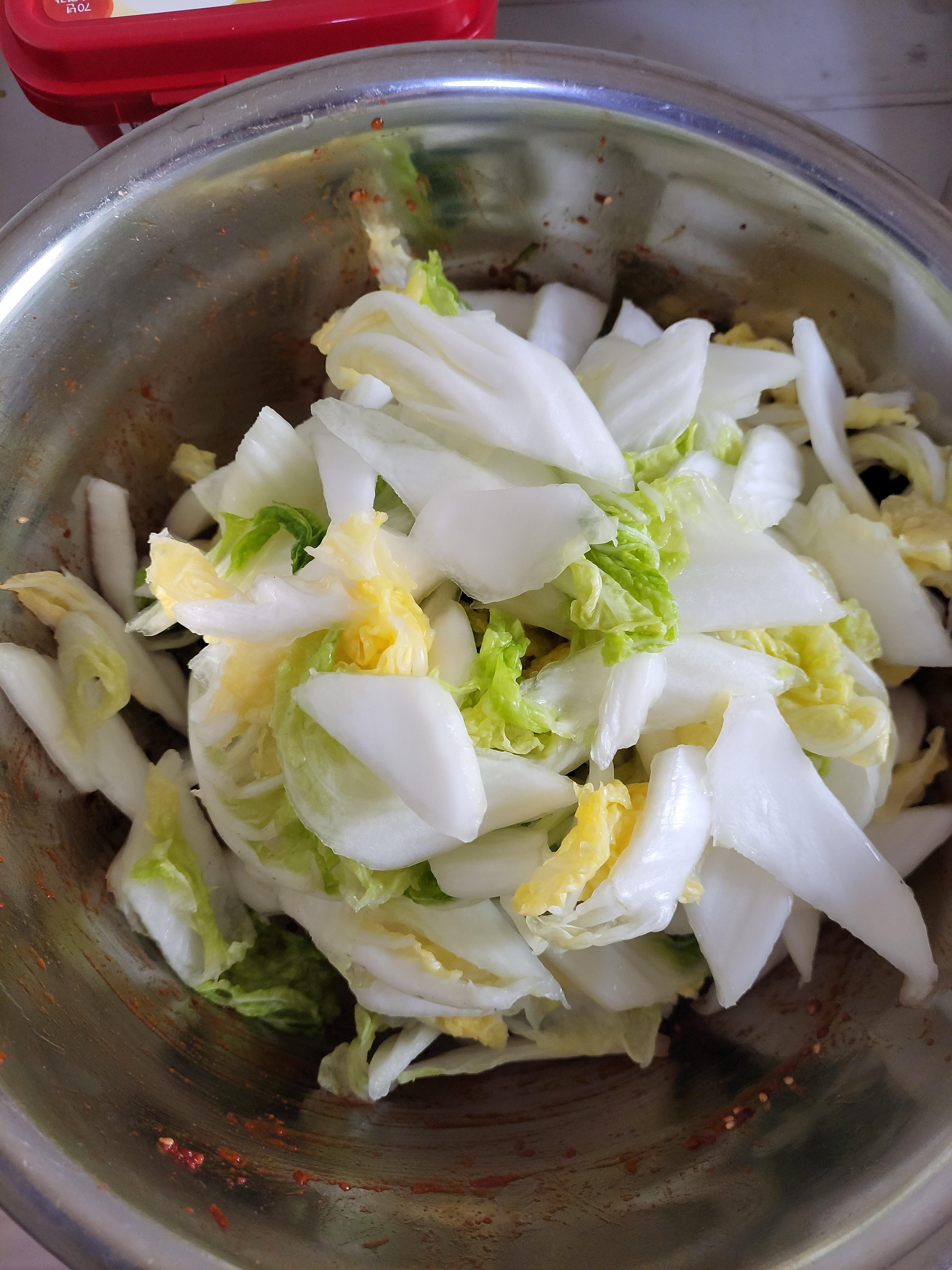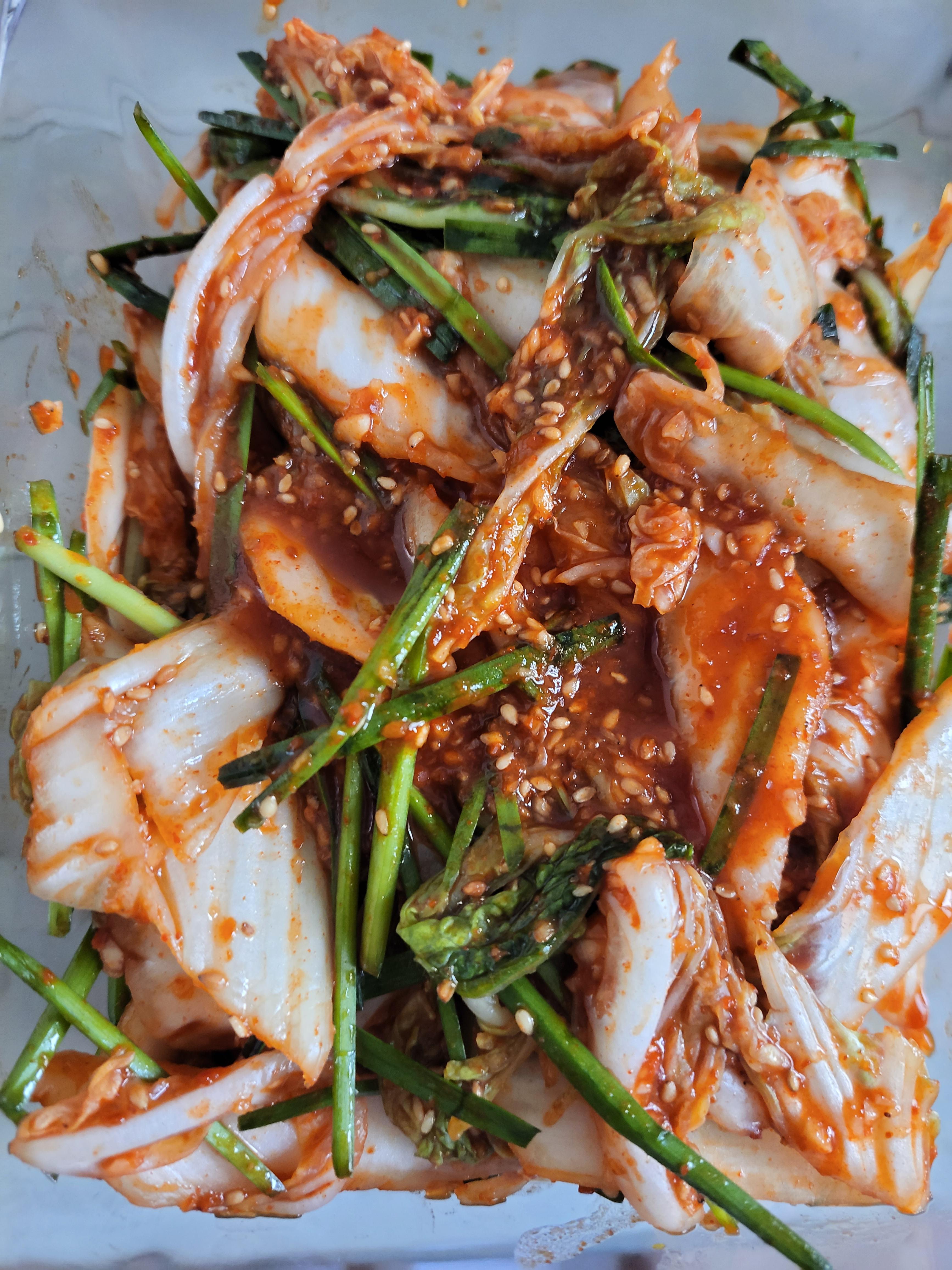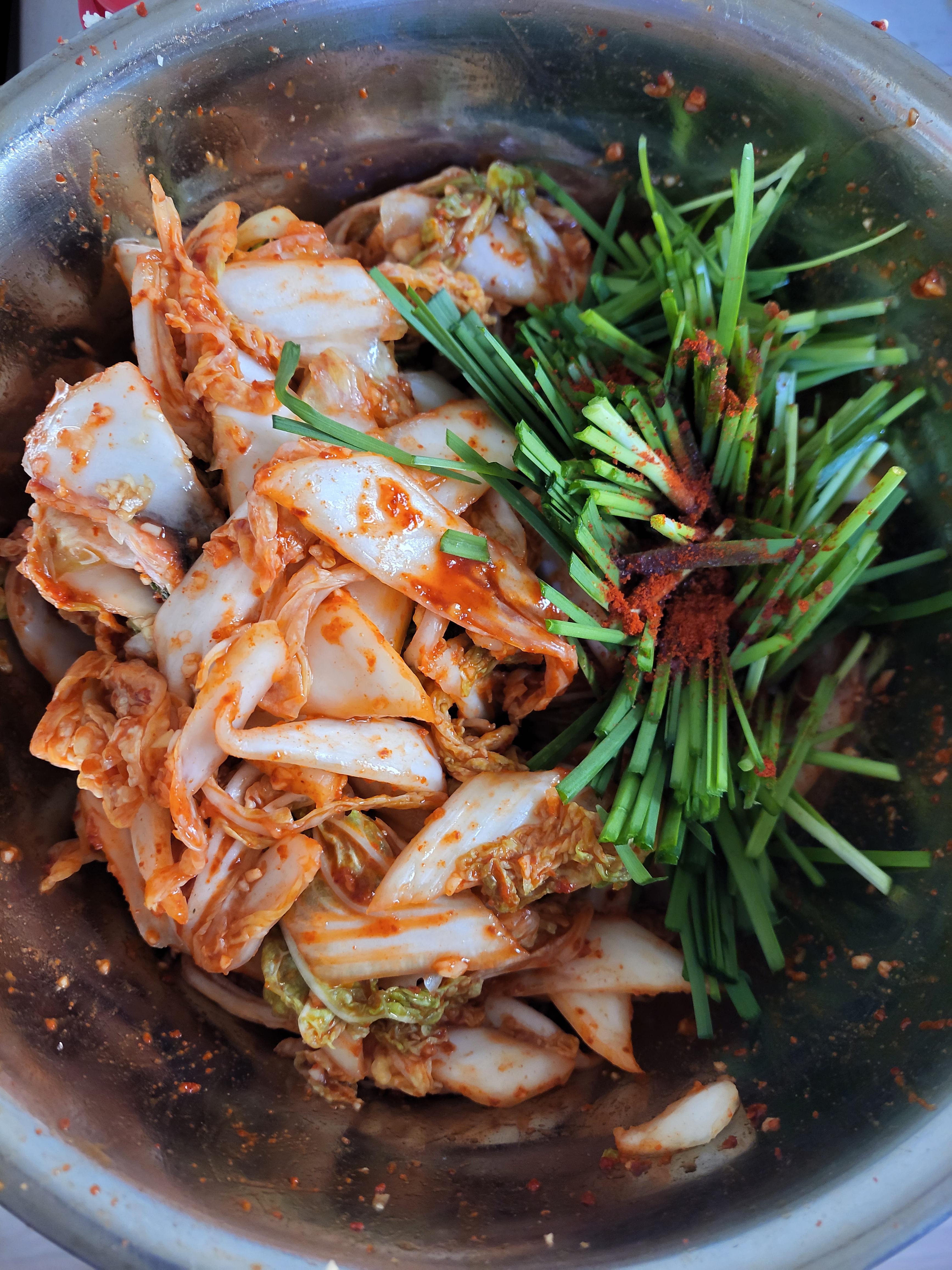 배추는 소금뿌려 절였다가 부추넣고 고운고춧가루 넣고 매실액, 액젓, 설탕약간, 마늘듬뿍, 통깨뿌려 버물버물~