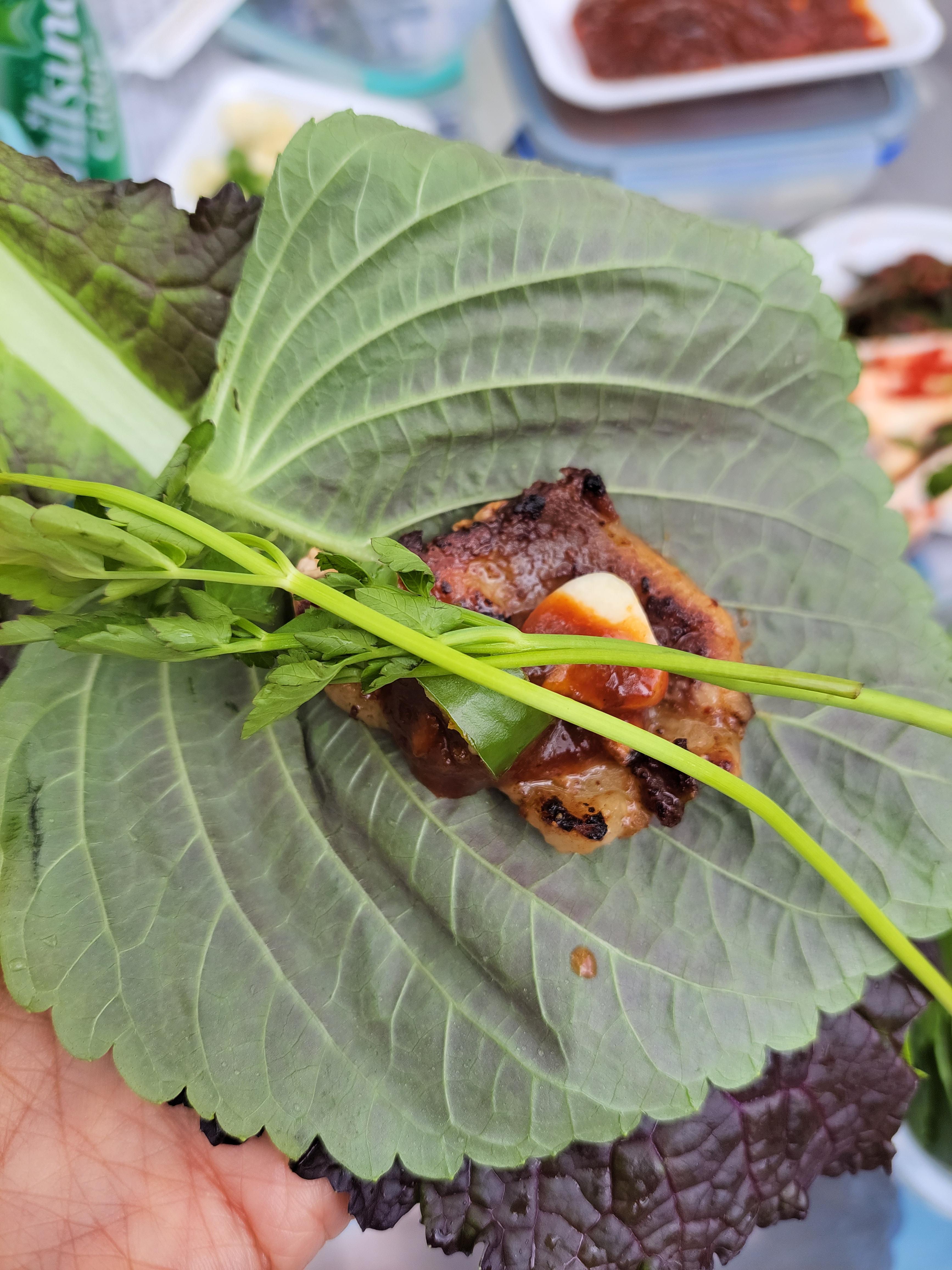 맛있게 고기 구워 준비해온 쌈 싸서 한 입^^