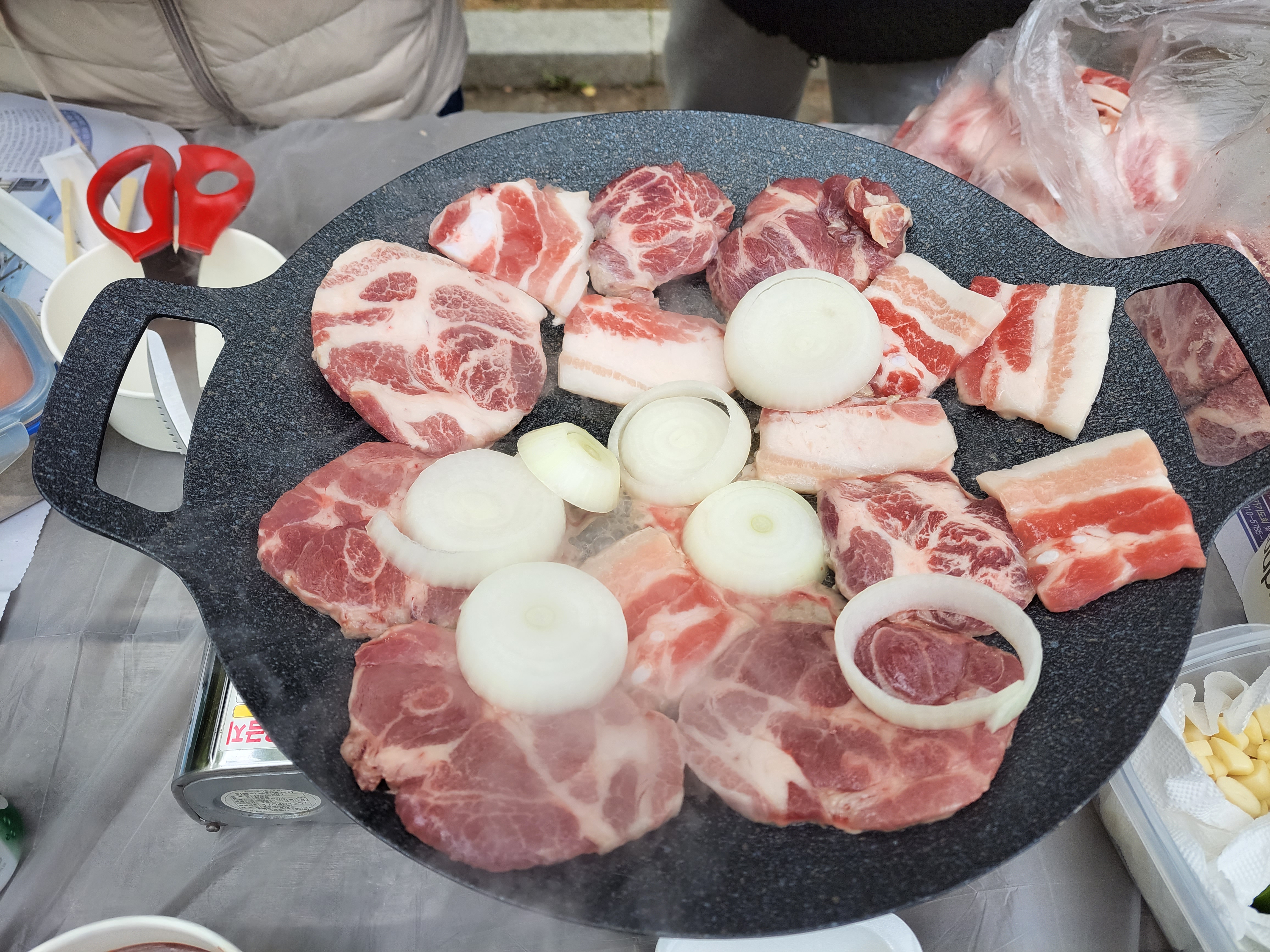 가스버너에 솥뚜껑 불판 올리고~ 목살과 삼겹살 굽굽^^