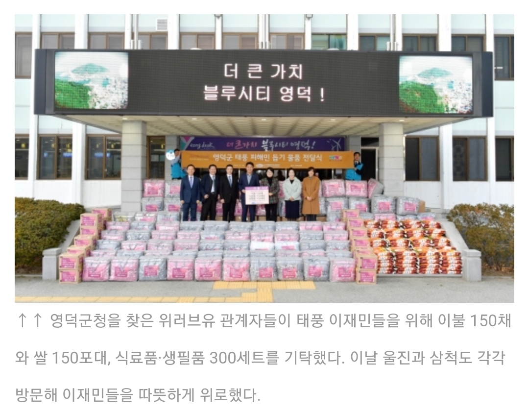 위러브유는 18일 울진과 영덕, 삼척을 각각 방문해 태풍 이재민들을 위해 5천만 원 상당의 겨울 이불 1520채와 식료품 430세트, 쌀 150포대를 지원했다.