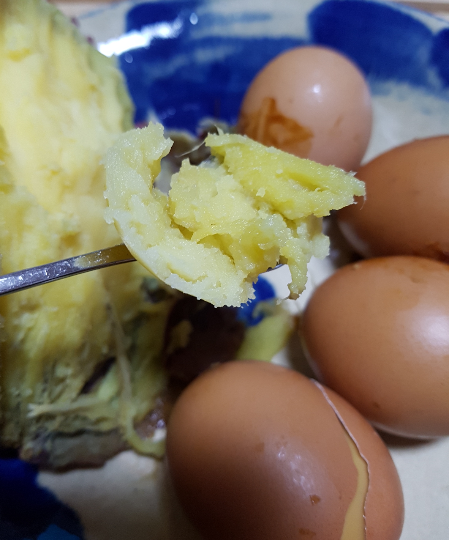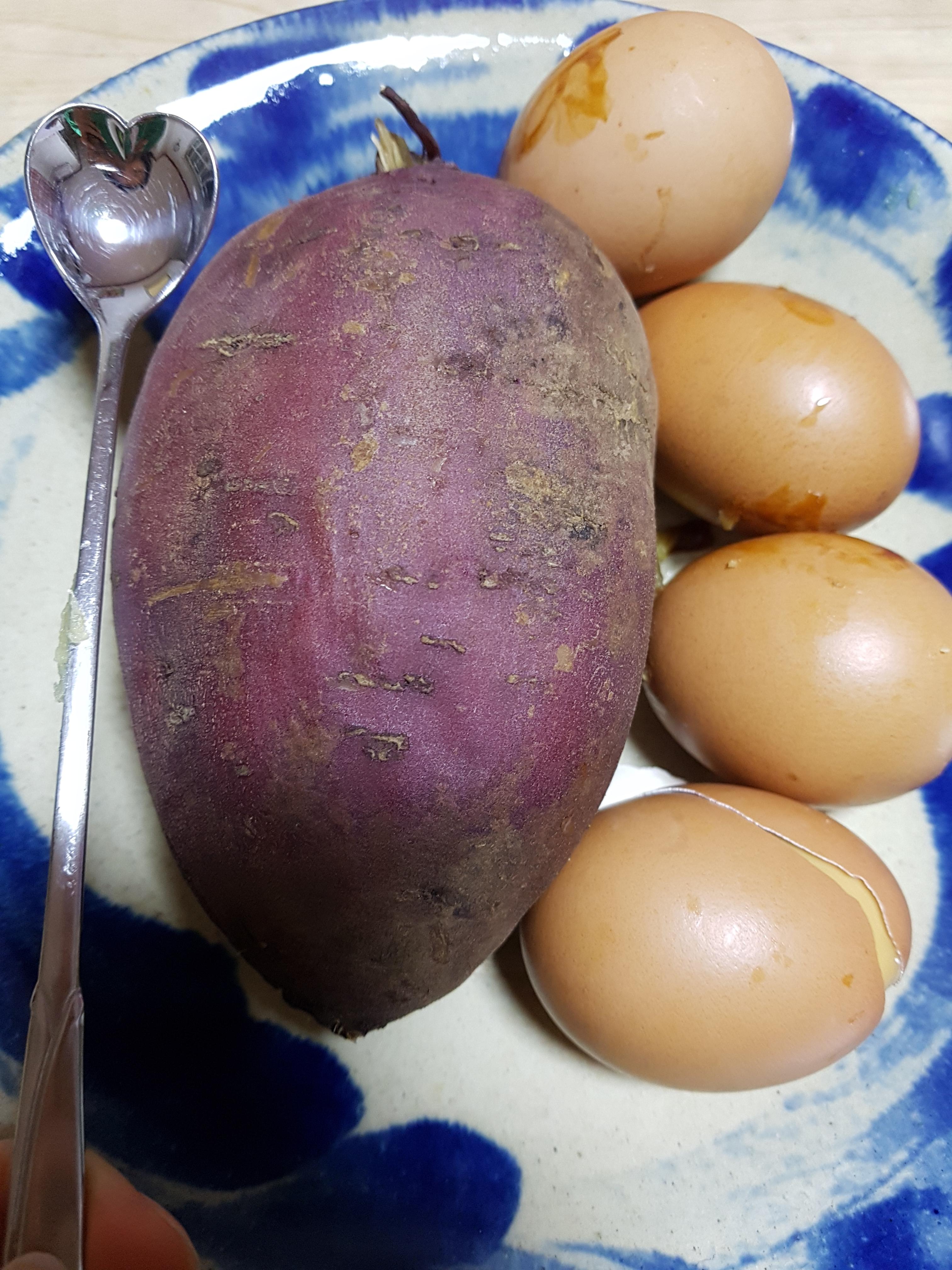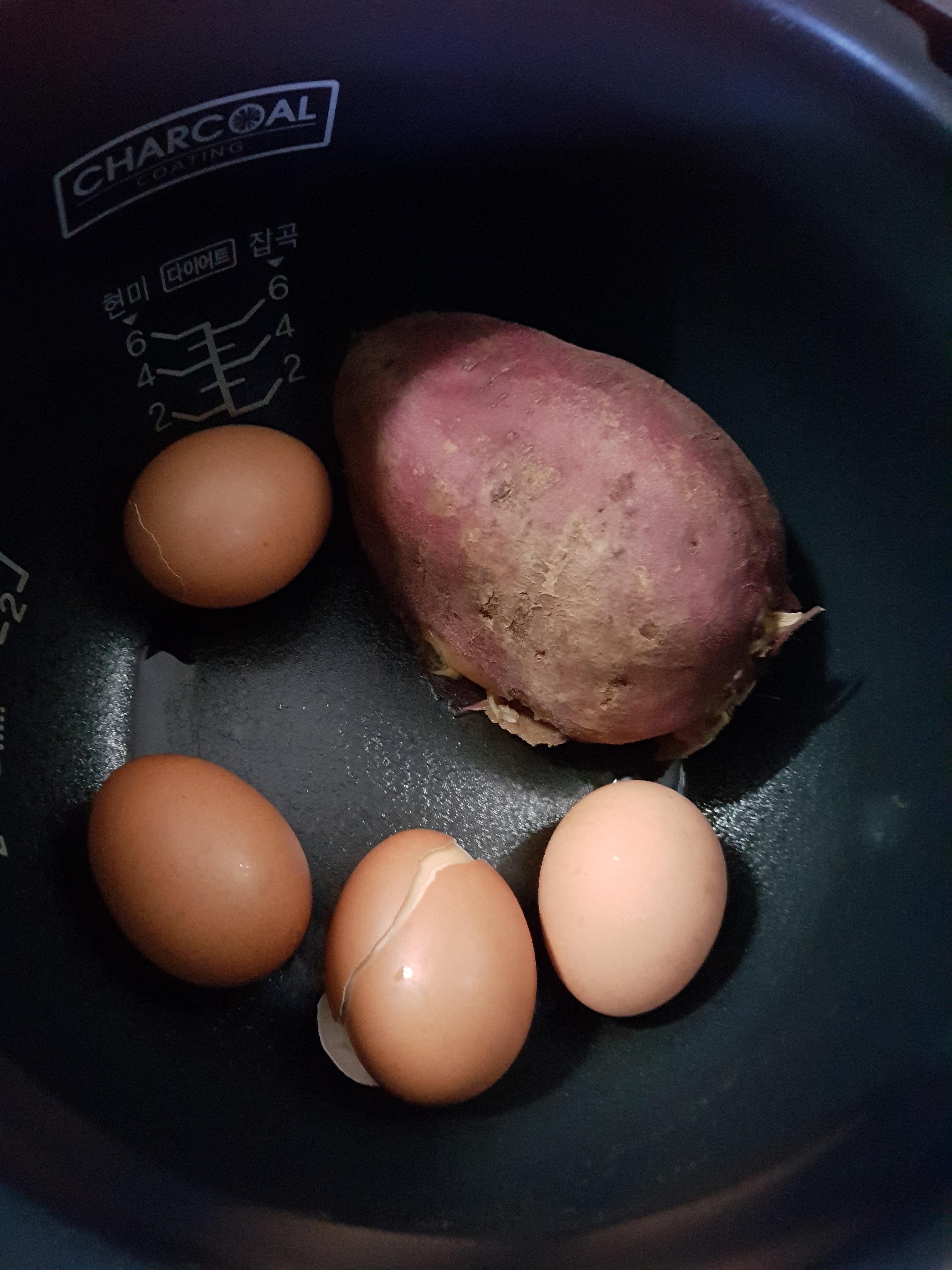 고구마 한개랑 계란 4개 밥솥으로 쪘어요.