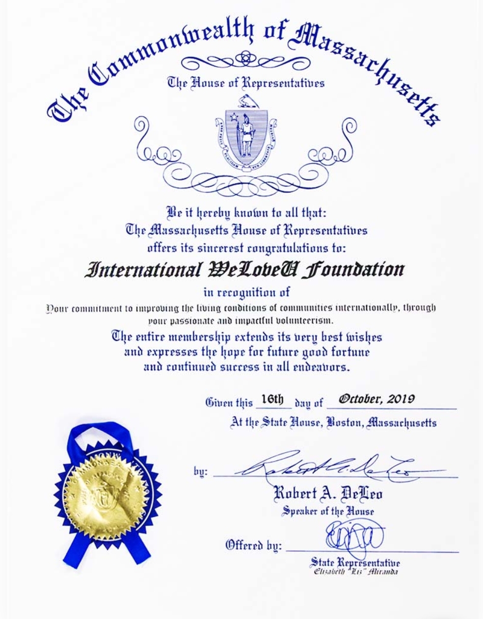 글로벌한 봉사활동을 진행하다보니 세계 각국에서 국제위러브유로 많은 상을 수여하고 있는데요~이번에는 미국 매사추세츠주 하원의회에서 표창장을 수여했습니다. 그 내용을 전해드리면~