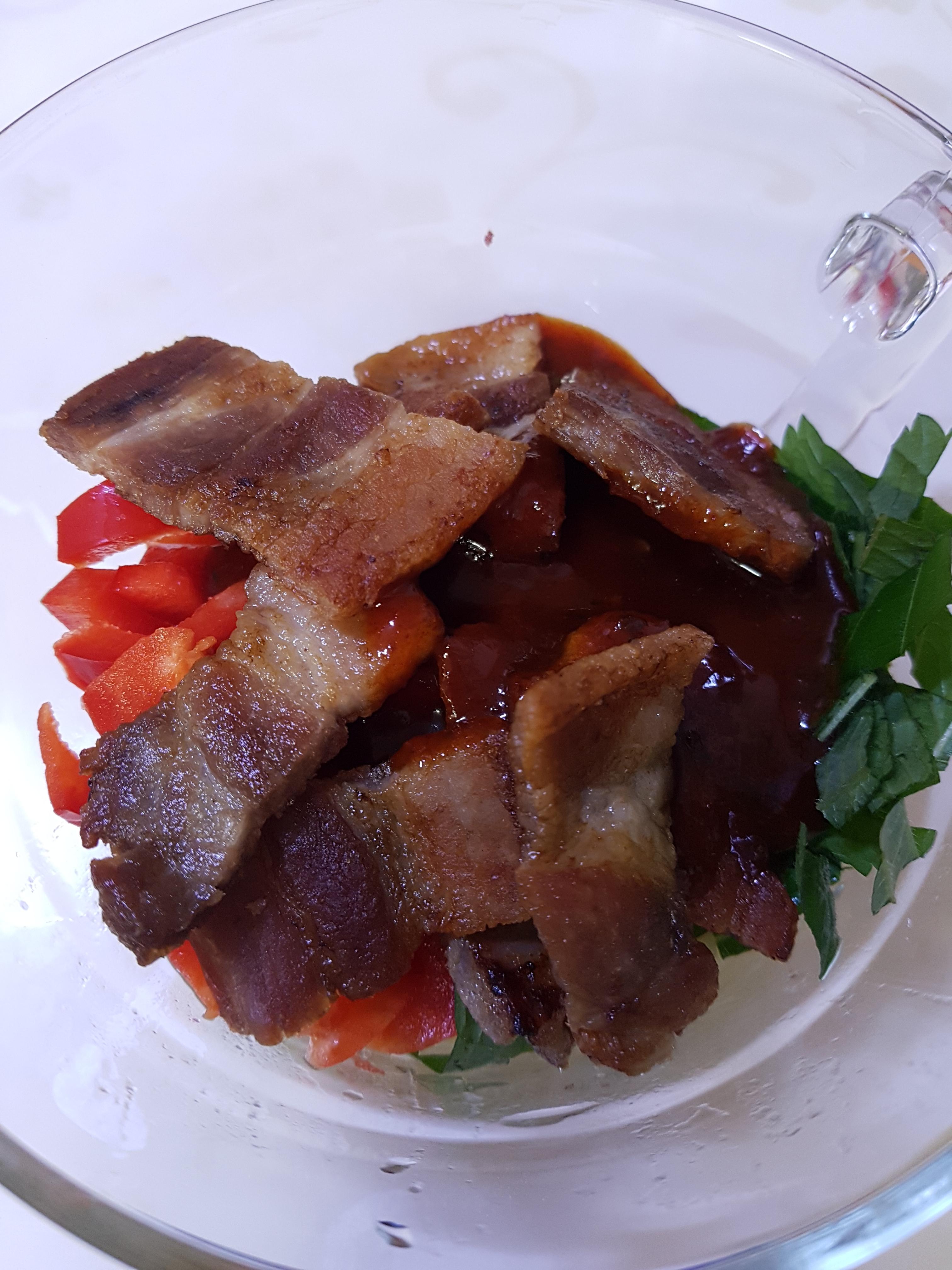 그다음 쫄면을 삶아 파프리카 깻잎을 추가해서 삼겹구이를 올려주었어요~