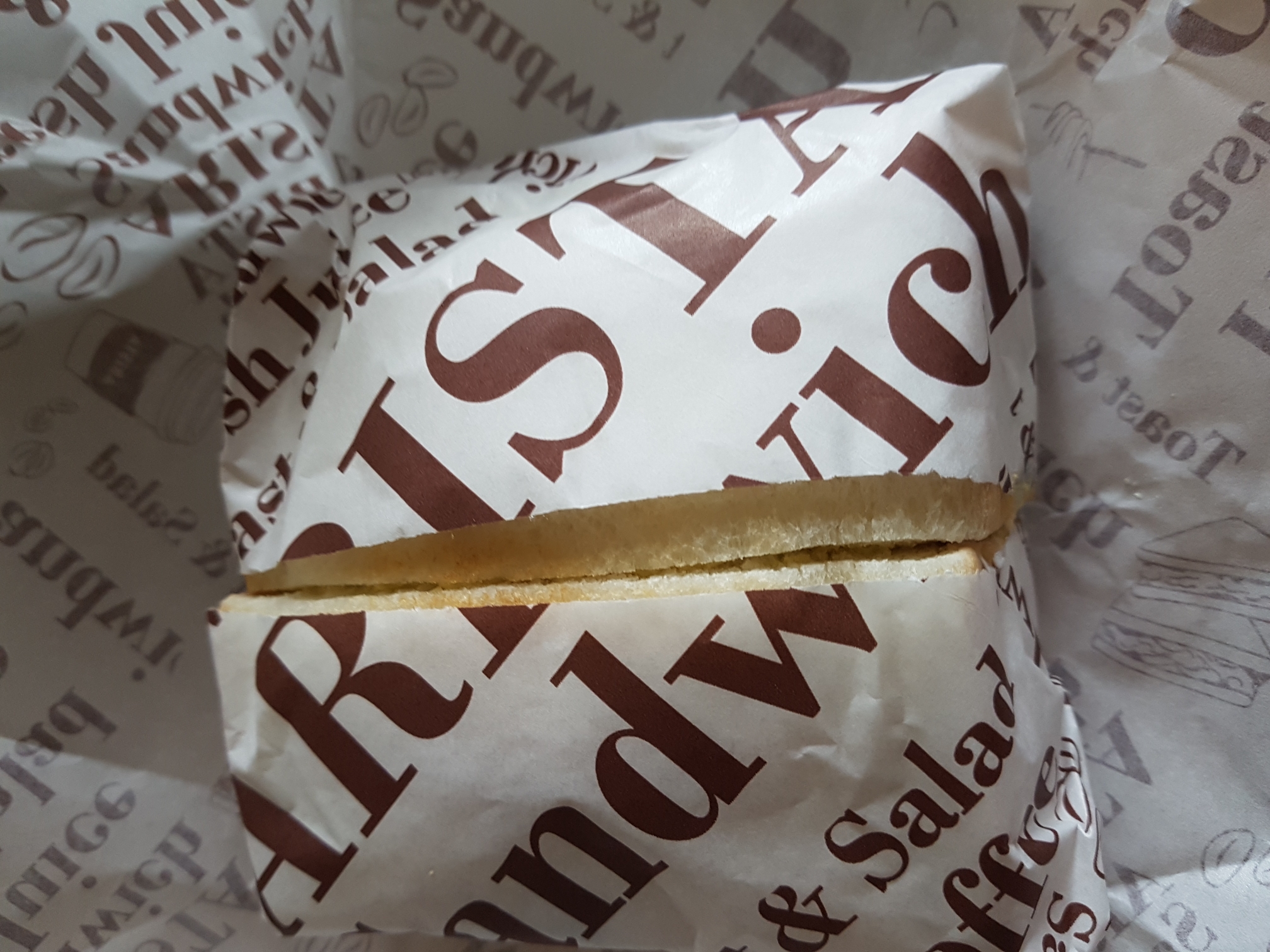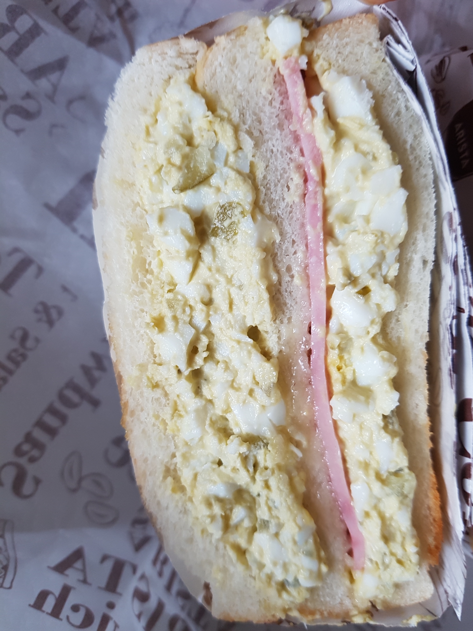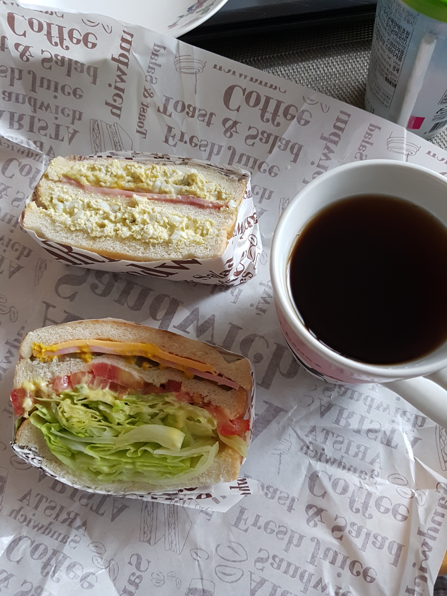 아리스타커피에서 사온 햄치즈샌드위치와 에그샌드위치 반씩 나눠 남편과 함께 먹었습니다.