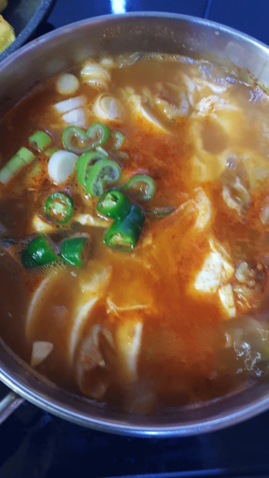 순두부찌개 양념이랑 야채에 물붓고 끓이다 순두부넣고 파랑 청양고추 조금 넣고 계란 한알 넣었습니다.