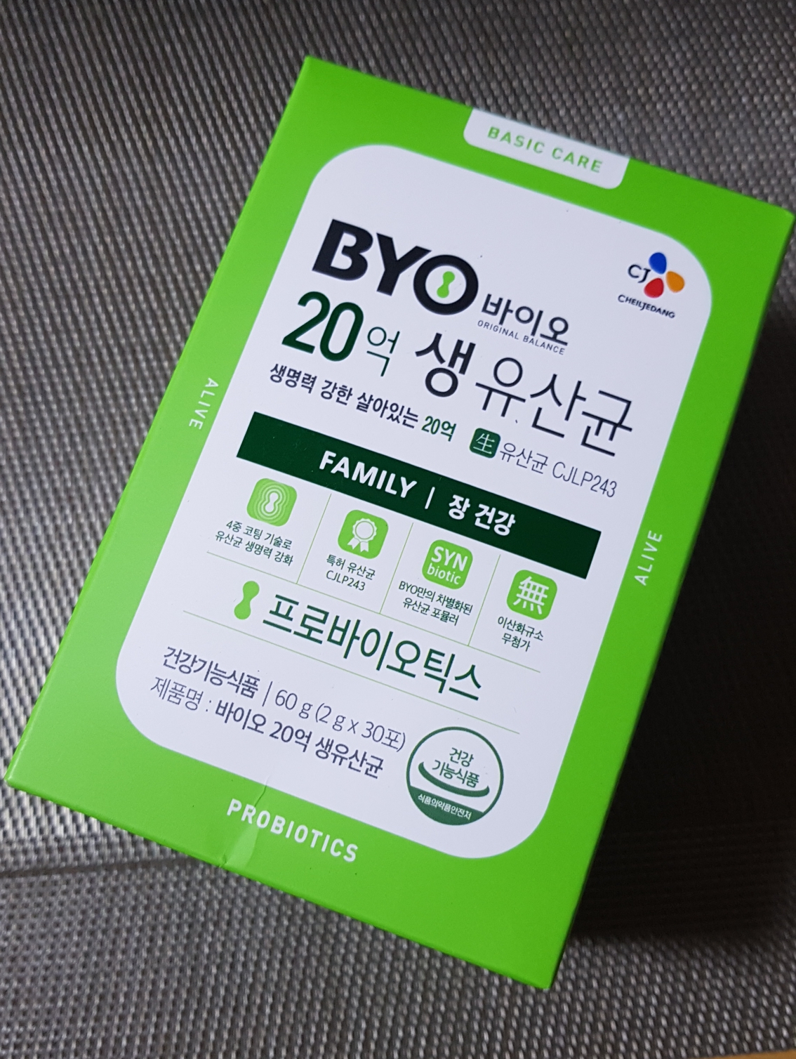CJ BYO생유산균은 우먼, 맨, 키즈, 패밀리등 선택사항이 너무 많아 오히려 머리아픔 ㅋ그냥 패밀리로 구매! 1박스 30포 들어있고 크기도 대싱 하루유산균19보다 1팩 포장이 더 크네요~