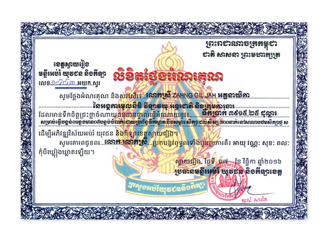 2016년 국제위러브유운동본부(회장 장길자)는 캄보디아 청소년체육교육청장 으로 부터 감사장을 수여했는데요~