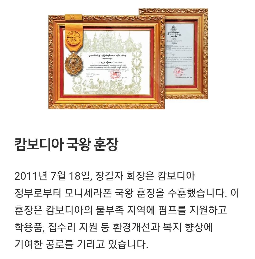 이러한 다양한 봉사활동으로 청소년체육교육청장 감사장 이전 국재위러브유 장길자회장님은 캄보디아 국왕 훈장도 수상한바 있습니다.