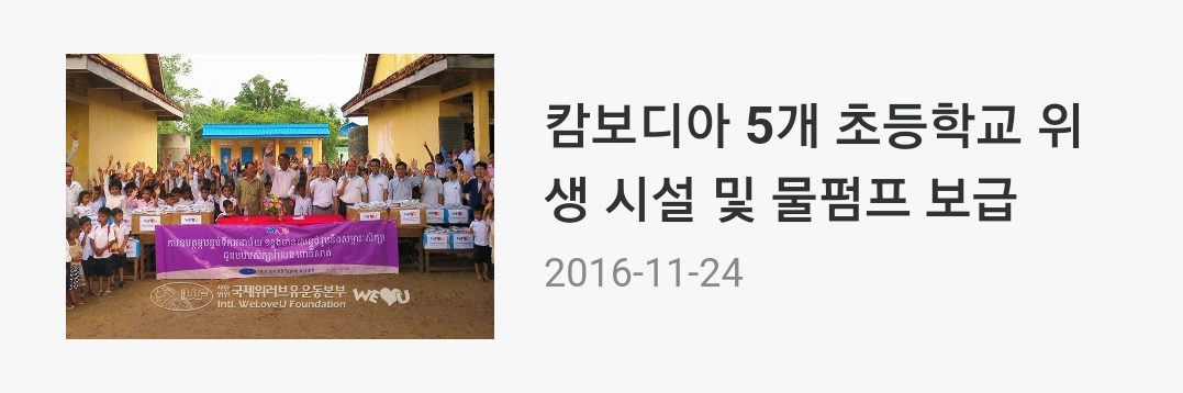 [ 2016년 11월, (재)국제위러브유가 캄보디아 5개 지역 초등학교에 위생 시설 및 급수 시설을 보급했다.