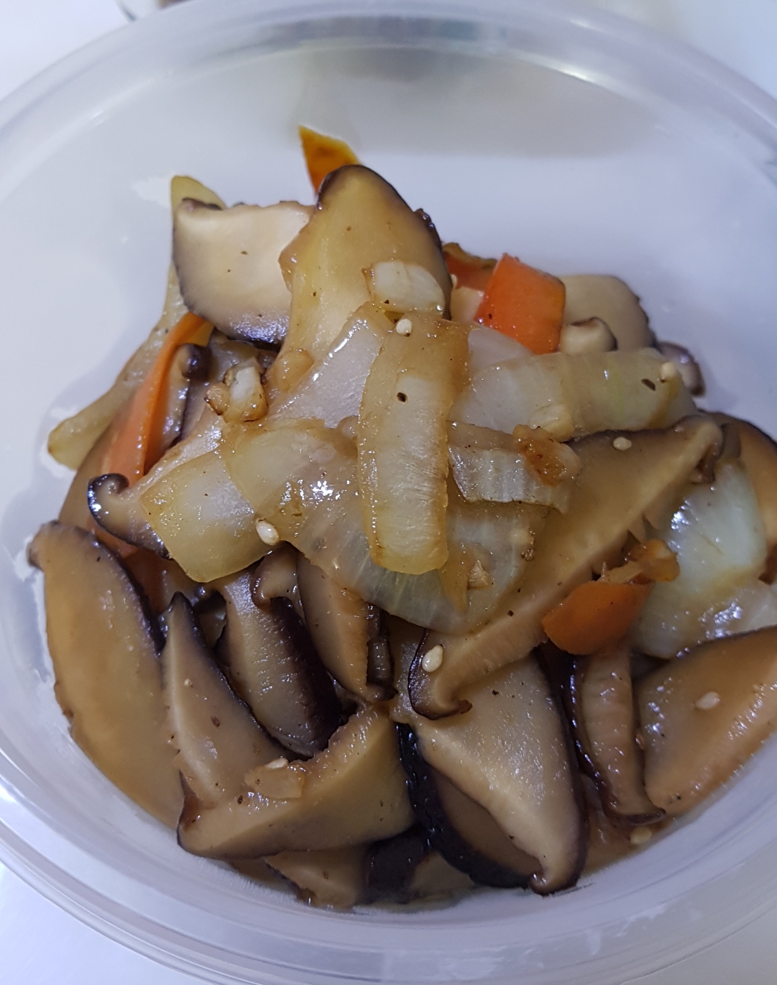 양파, 당근에 소금좀 뿌리고 마늘 다져서 올리브유 넣고 볶다 표고버섯 넣고 수분이 좀 생길라치면 간장과 올리고당 약간 후춧가루 뿌려 마지막으로 참기름, 통깨 살짝 넣고 완성.