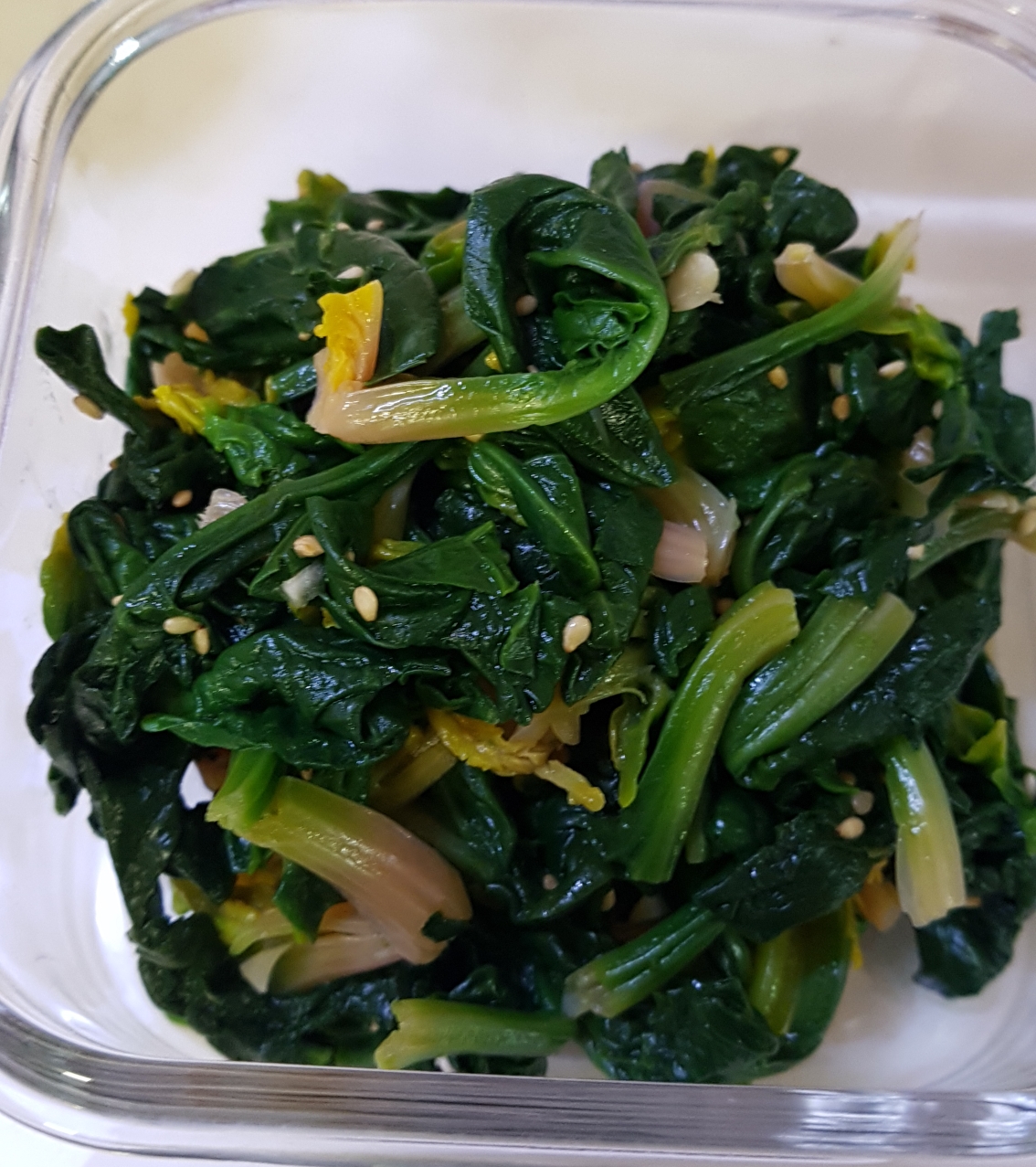 데쳐 다진마늘과 간장 소금 통깨 참기름 넣고 팍팍 무친 맛있는 시금치무침.