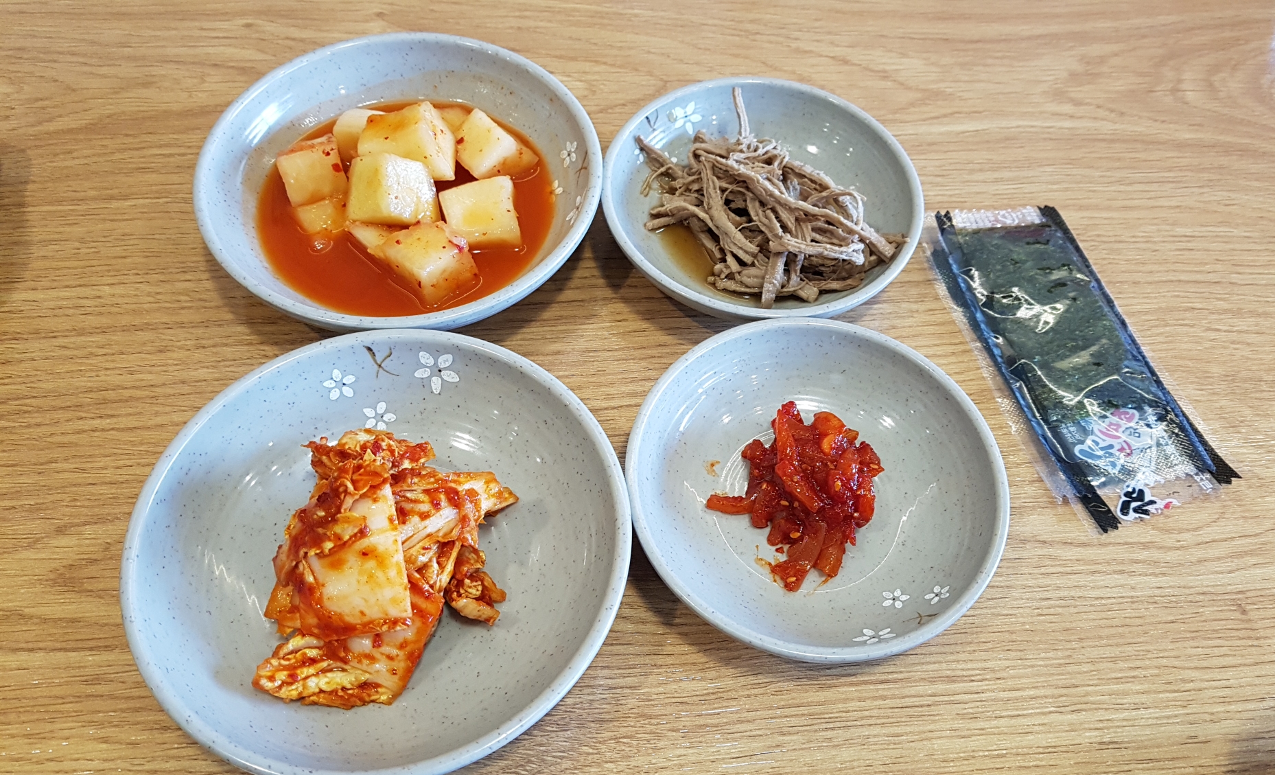 깍두기, 장조림, 배추겉절이, 오징어젓갈, 김