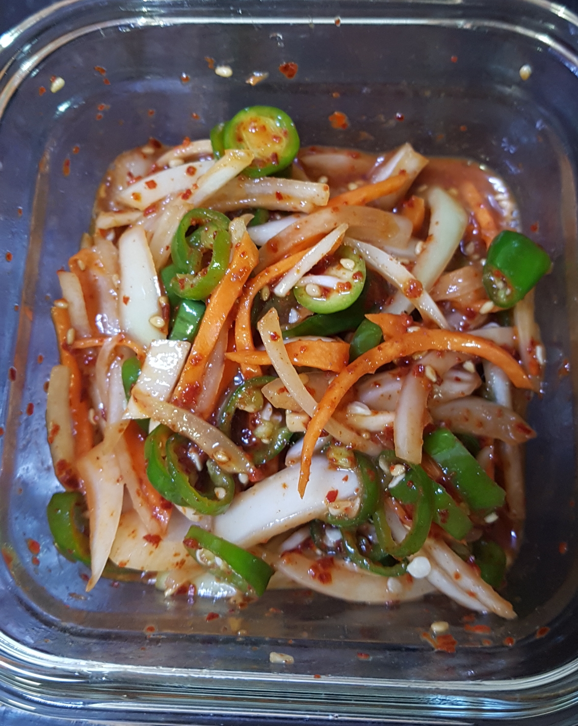 청양고추3개, 양파 약간, 마늘3쪽, 당근약간, 다진파약간, 고추가루 3t, 통깨, 매실액, 참기름 넣고 섞어줍니다.