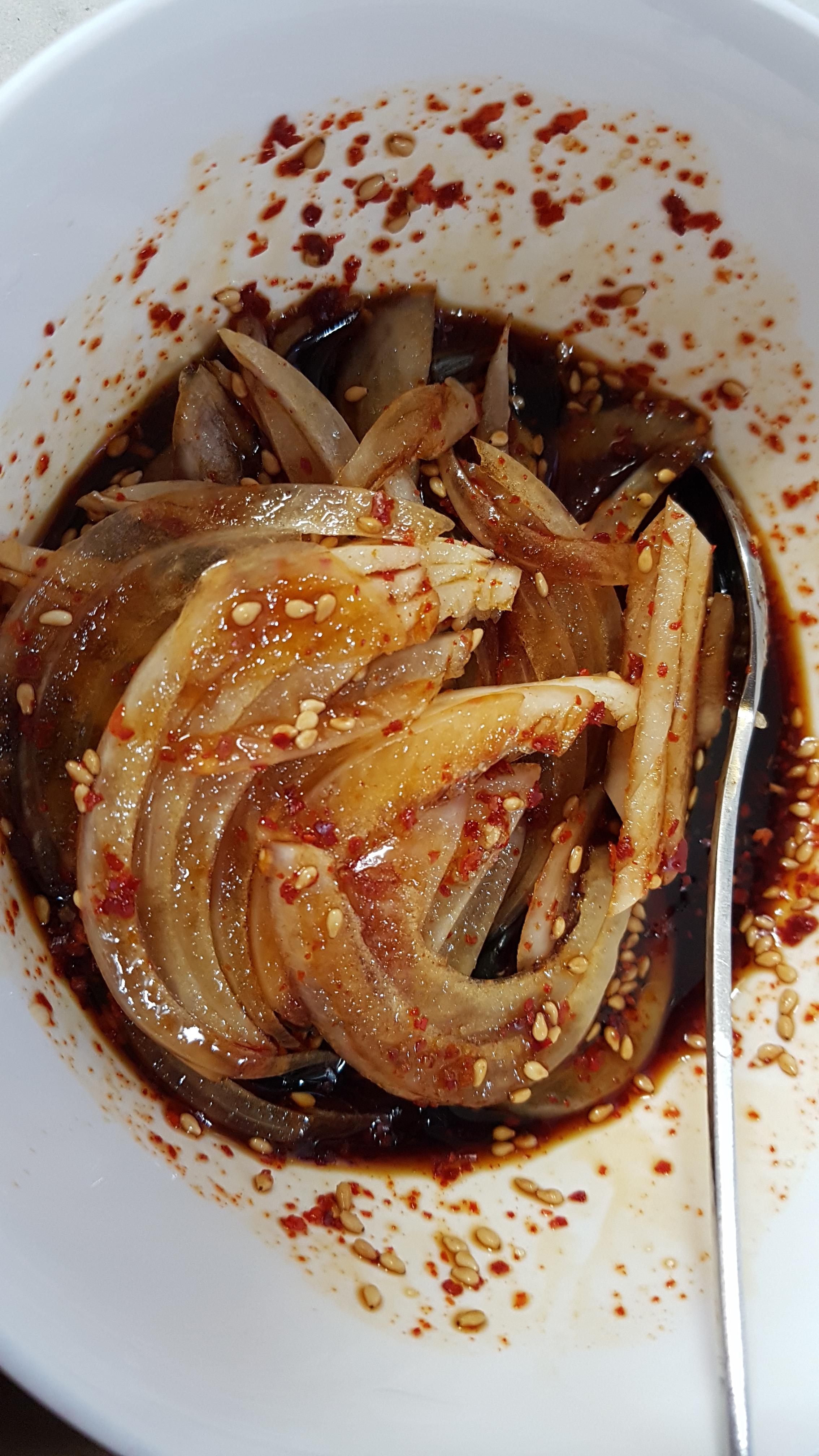 양파 채썰어 간장소스에 절여 같이 먹어도 맛있어요~