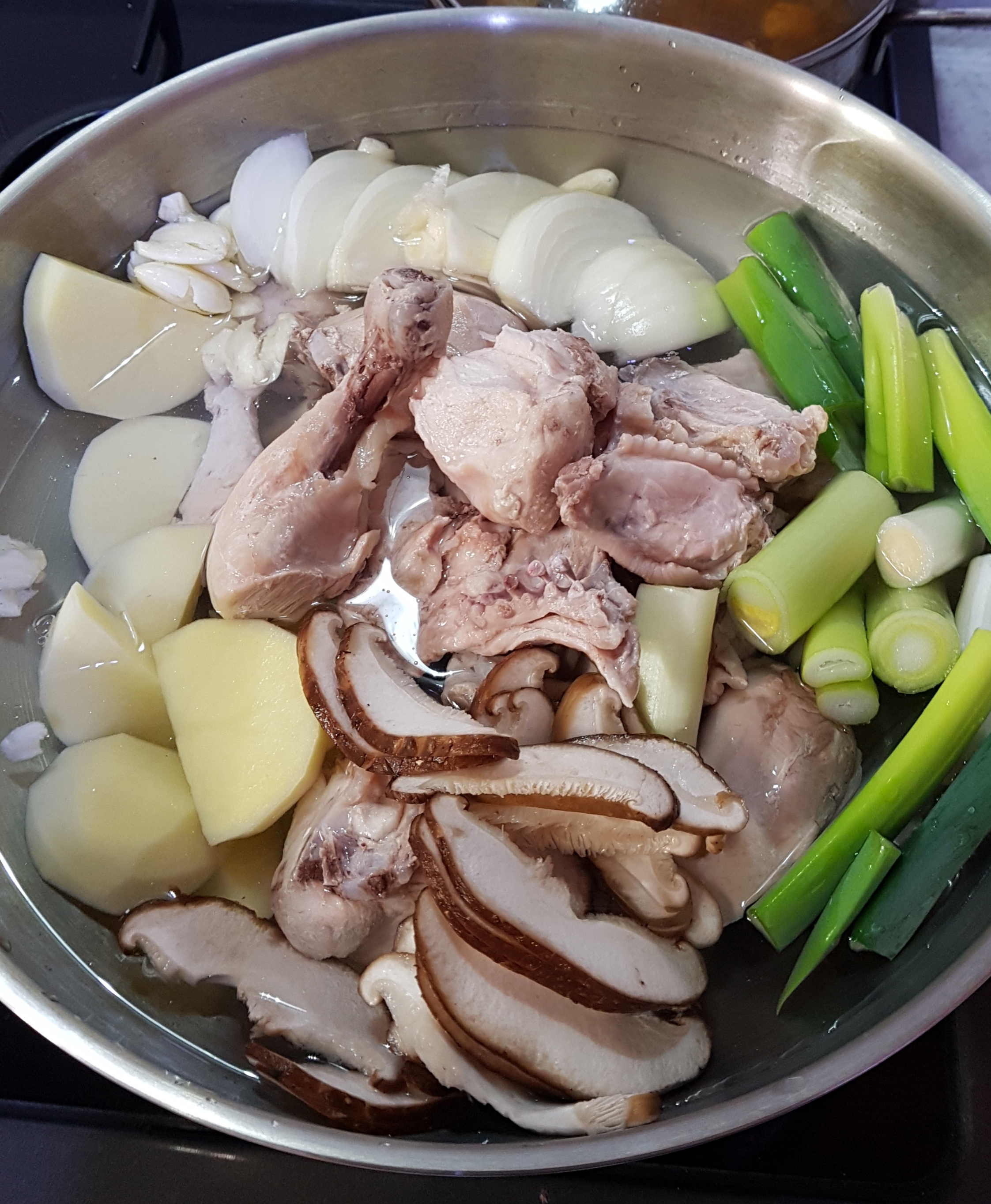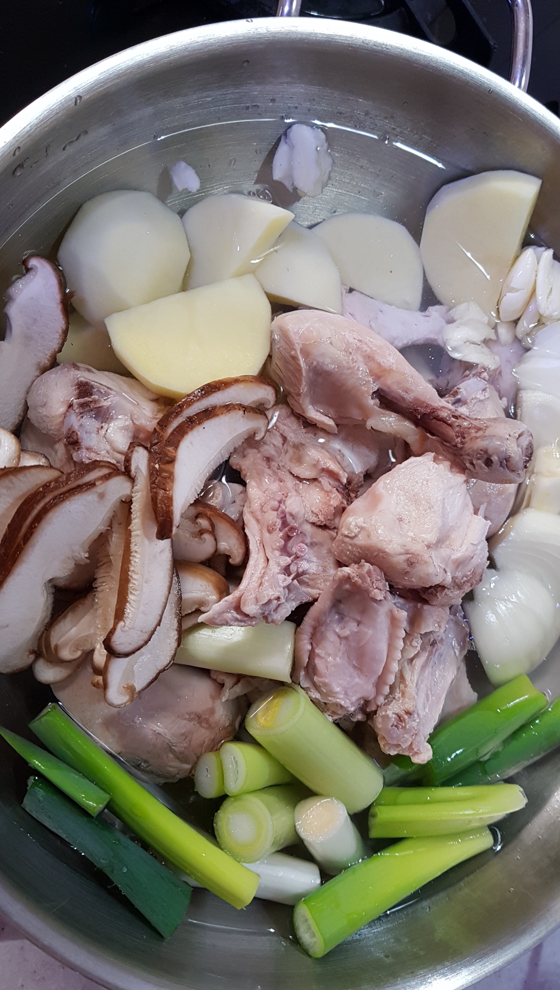 궁중팬에 닭, 감자1알, 양파반개, 대파1대, 마늘5알,표고버섯 썰어넣고 물을 넉넉히 부어 끓였습니다.