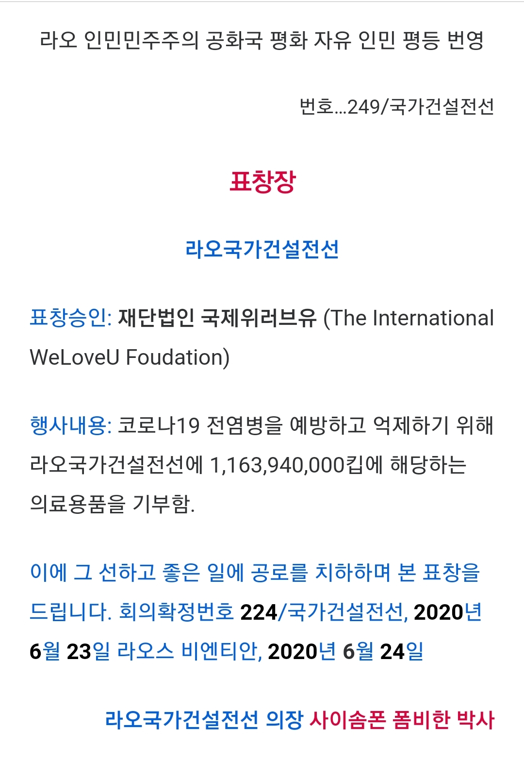 그로인해 라오스 국가건설전선 의장으로 부터 표창장을 수여하게 되었습니다.