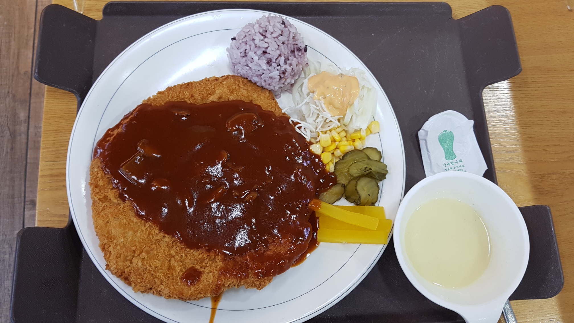 스프 약간에 단무지, 오이피클, 옥수수콘, 양배추샐러드, 밥 한덩어리~