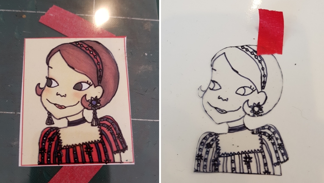 그다음 머리라인, 머리띠 라인등 비닐 라인 뜬 것을 조각내서 다시 샤프로 라인을 대고 그려줍니다.