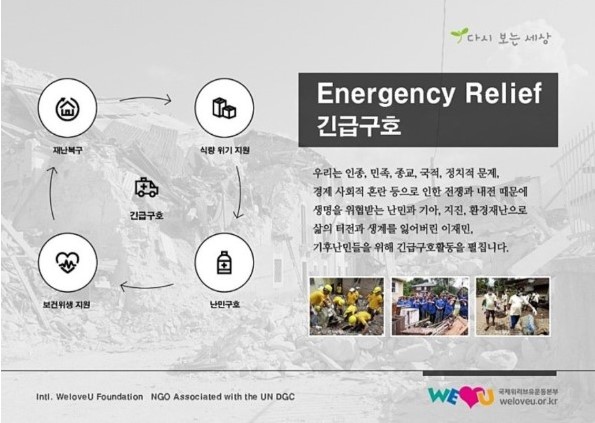 UN DGC(전 DPI·공보국) 협력단체인 위러브유는 가족을 사랑하는 ‘어머니의 마음’으로 국내뿐 아니라 전 세계에서 복지활동을 펼친다. 긴급구호, 빈곤·기아 해소, 물·위생 보장, 교육 지원 등 다양한 지원을 각 나라 상황에 맞게 진행한다.