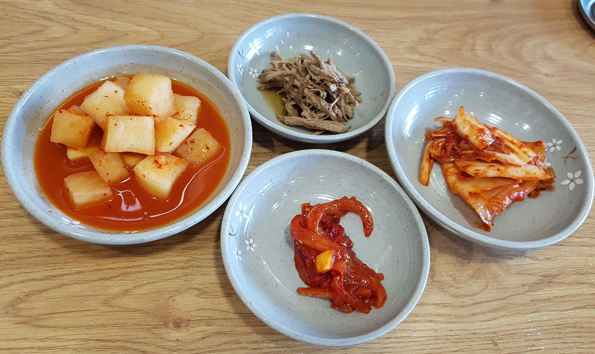 깍두기, 오징어젓갈, 장조림, 겉절이김치 반찬