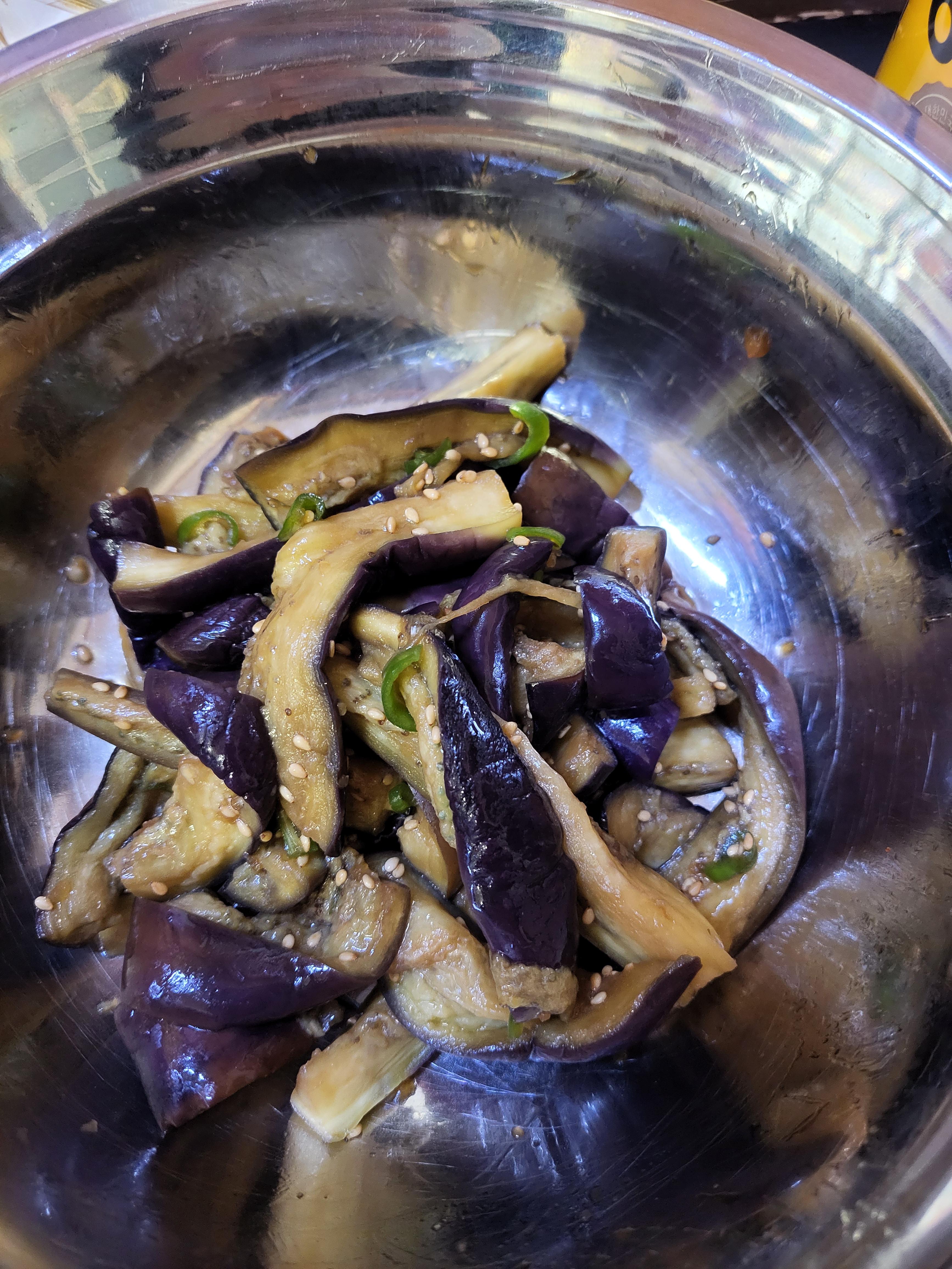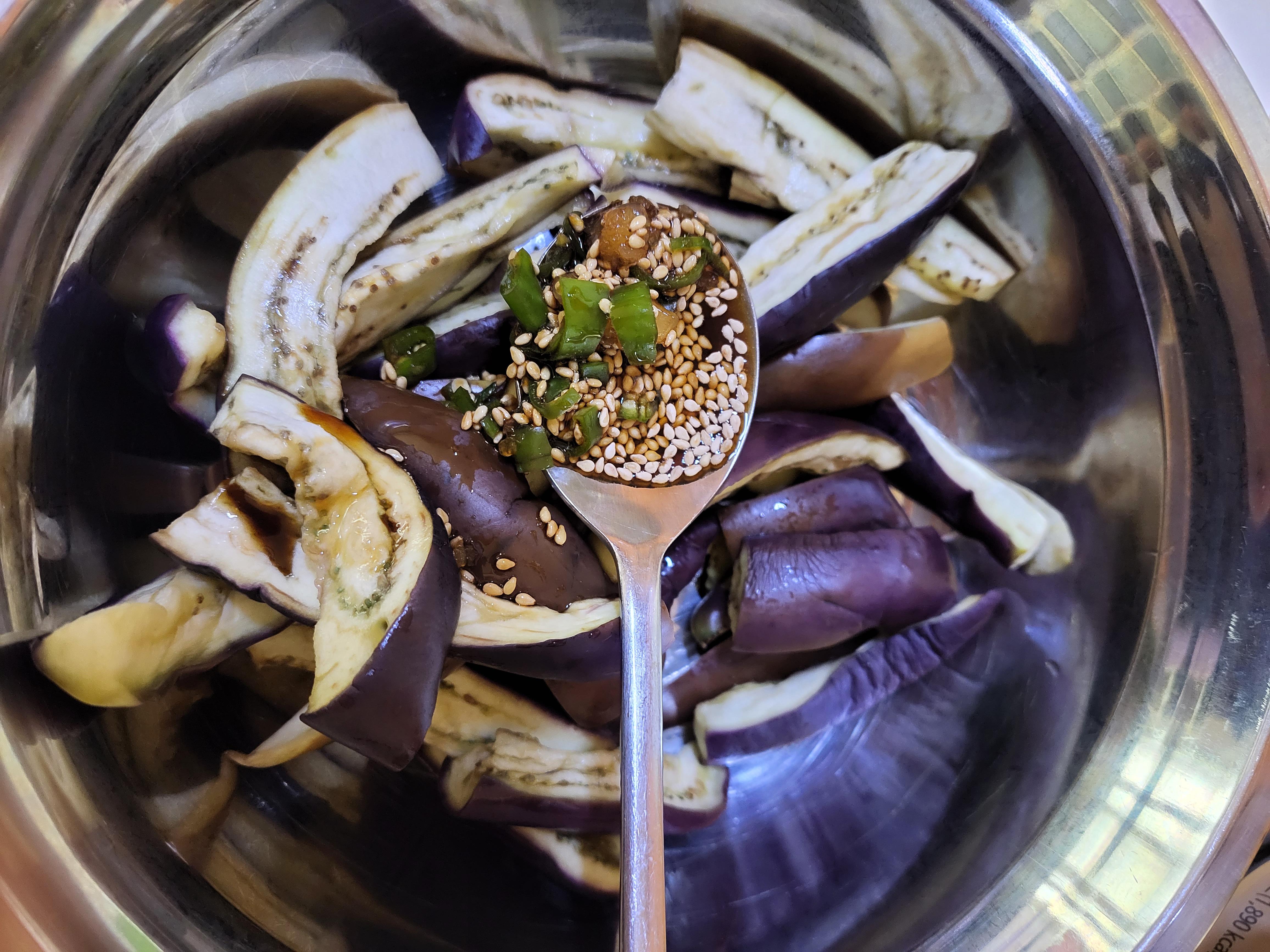 양푼에 전자렌지이용해 찐 가지랑 양념을 넣고 조물조물 살살 버무렸어요