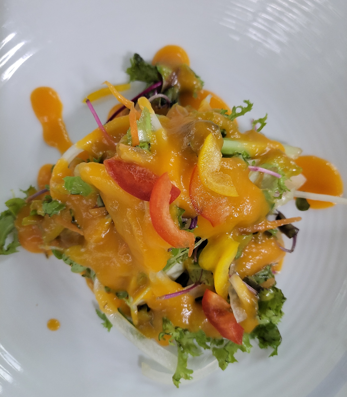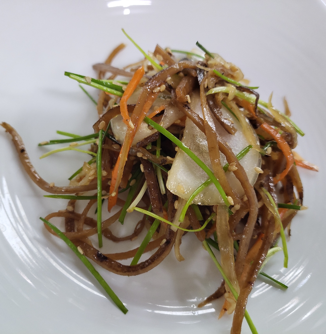 홍시인가 싶은 노란색의 새큼한 소스의 샐러드, 들깨소스에 버무려진 의외로 상큼한 아삭한 연근, 우엉잡채, 무쌈말이가 먼저 식욕을 돋구어 준다.