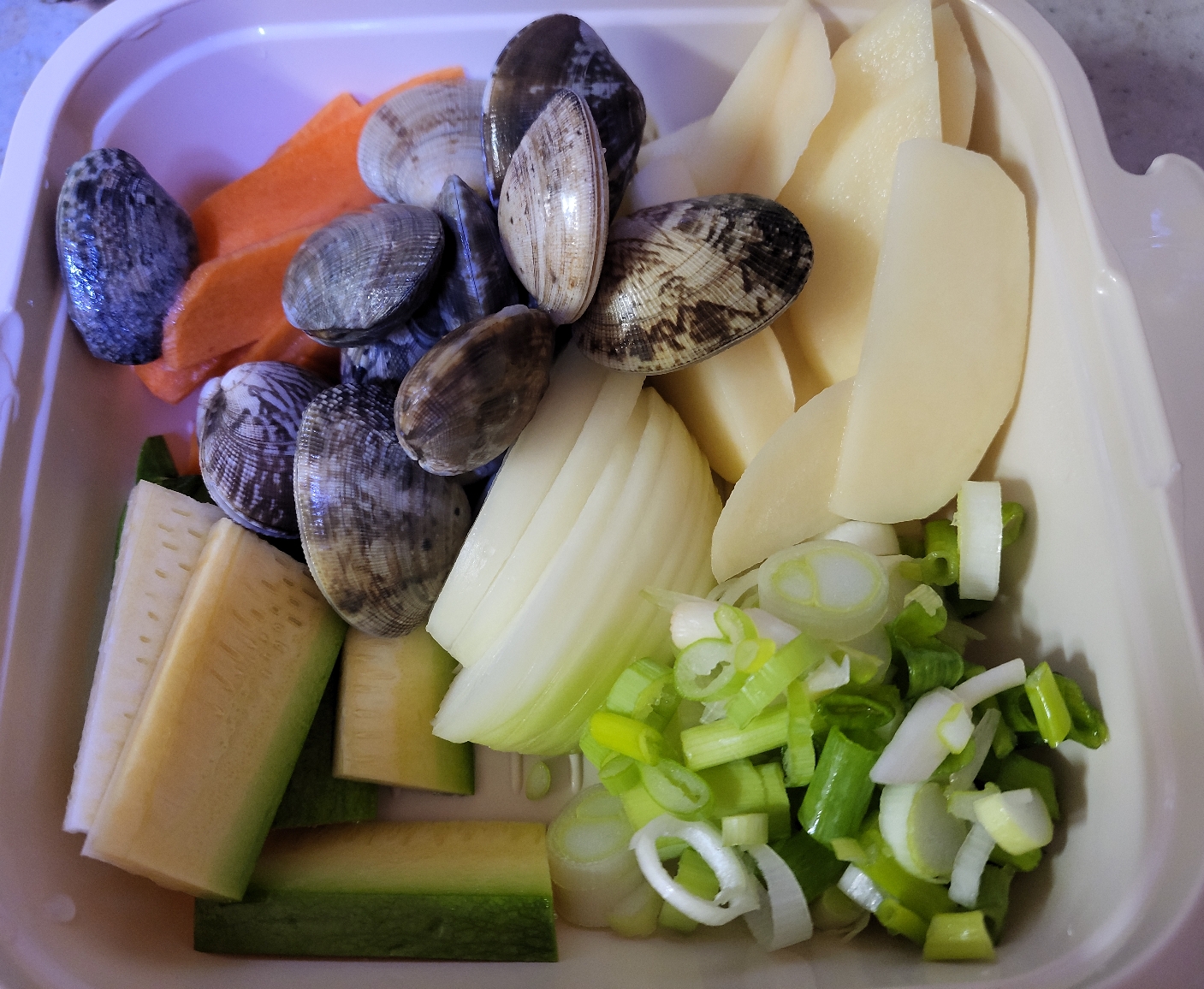 수제비에 들어갈 감자1알, 양파, 호박, 당근약간, 대파나쪽파, 바지락약간, 사진엔 없지만 냉동시켜둔 표고버섯도 준비해 둡니다.