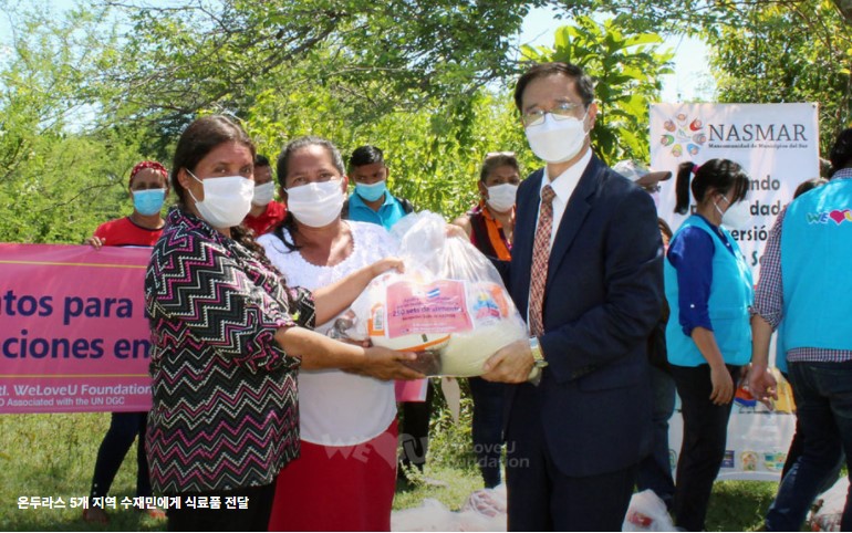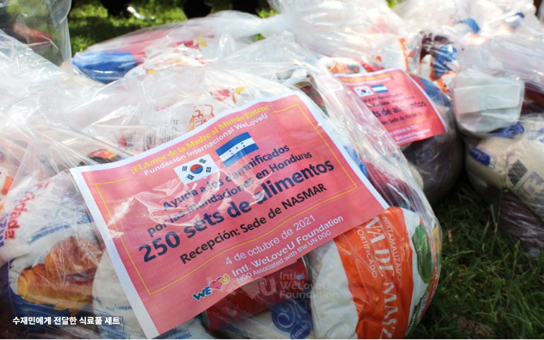 위러브유 본부는 현지 지부와 연락하며 온두라스 수재민의 어려운 상황을 신속히 확인한 후 ‘엘트리운포, 마르코비아, 산로렌소, 나카오메, 고아스코란’ 지역 수재민 250가정에 식료품을 긴급 지원하기로 결정했다. 그리고 지난 10월 4일 쌀·콩·옥수숫가루, 스파게티 면, 소금·설탕·버터, 케첩·커피 가루, 통조림 등을 알차게 담은 식료품 세트를 수재민들에게 전달했다. 전달식에는 위러브유 회원들과 마르코비아시장(NASMAR 회장 겸직), 엘트리운포시장, 남부지방자치단체 관계자 및 지원 대상자들이 참석했다.