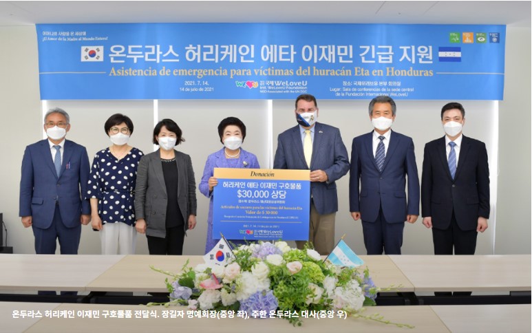 ☆2021년 7월 14일 경기도 판교 국제위러브유운동본부에서 온두라스 허리케인 이재민 돕기위한 구호물품 지원 전달식(3만달러 상당의 구호물품 지원 약속)
