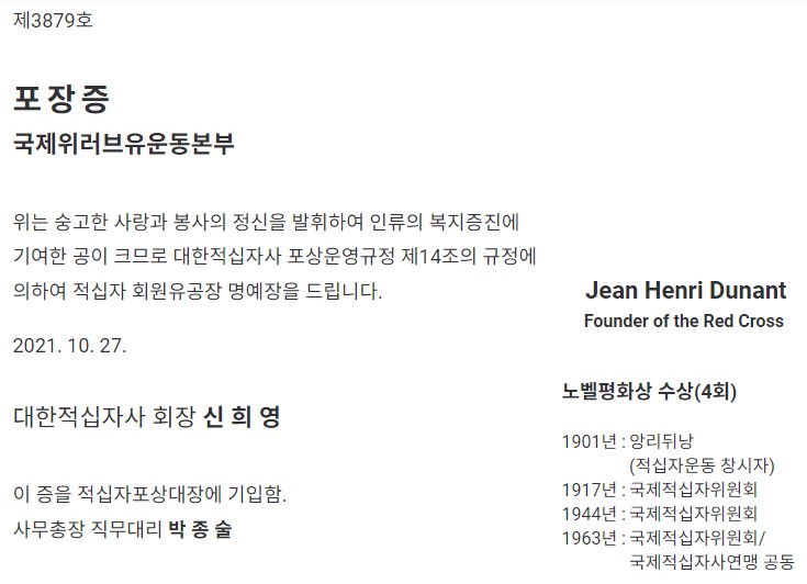 대한적십자사 포상운영규정 제14조의 규정에 의하여