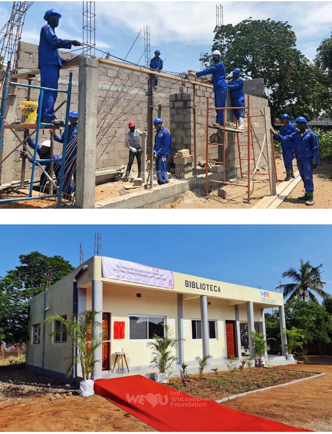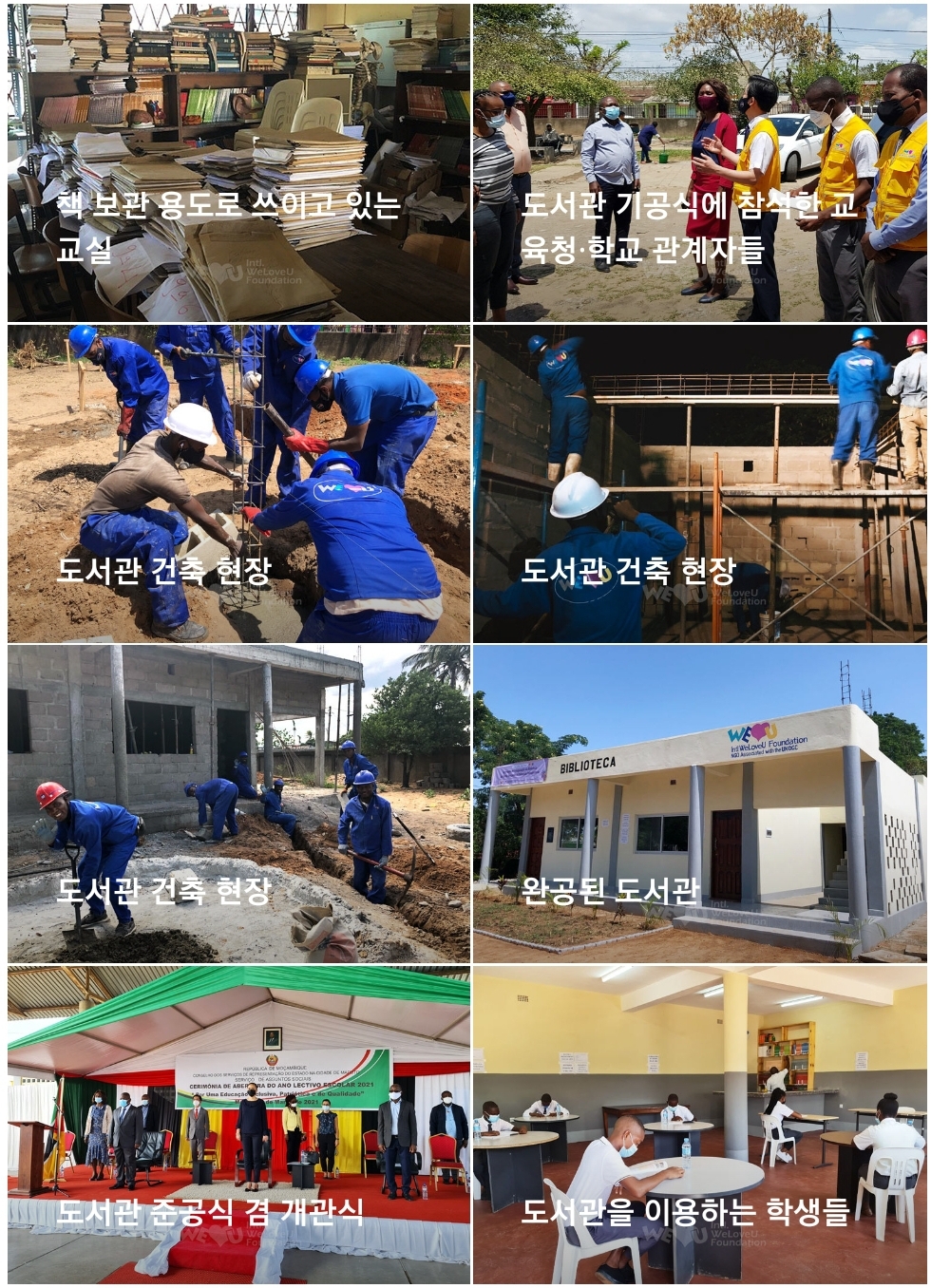 관련 직종에 종사하는 위러브유 회원 10명이 팀을 꾸려 공사에 착수했고, 국제위러브유 모잠비크 지부 회원들은 각자 일과를 마치면 학교로 와서 부지런히 공사를 진행했습니다. 40도를 웃도는 무더위에도 밤낮을 가리지 않고 작업에 몰두하며 6개월간의 공사기간을 거쳐 도서관이 완공되었습니다.