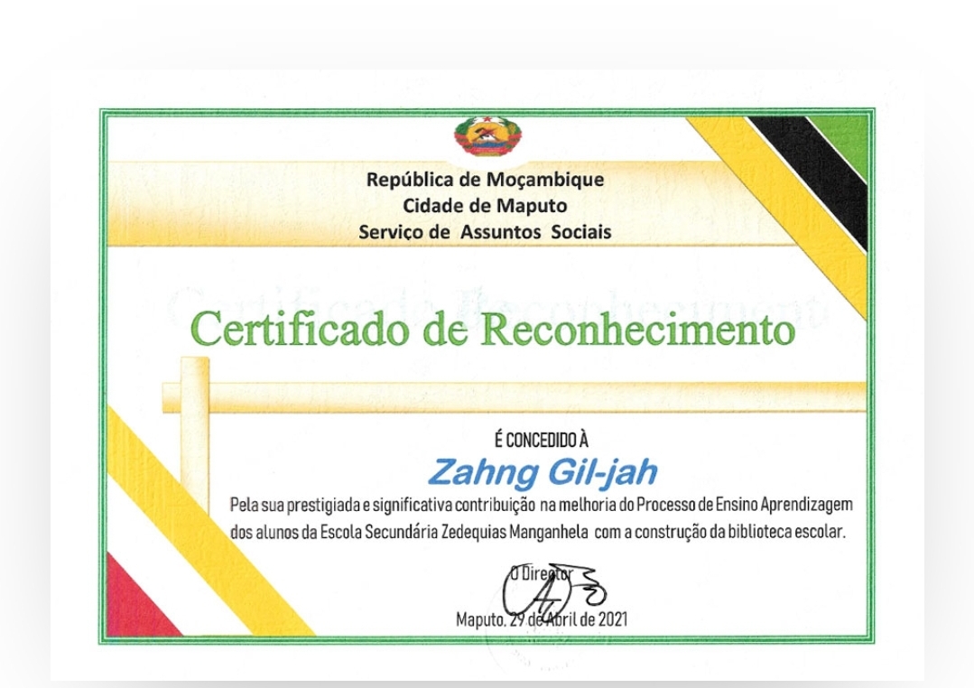 학교 도서관 건축으로 제데키아스 망가녤라 중고등학교 학생들의 교육 학습 과정 개선에 권위 있고 의미 있는 기여를 해주신 장길자 님께 이 인증서를 드립니다.