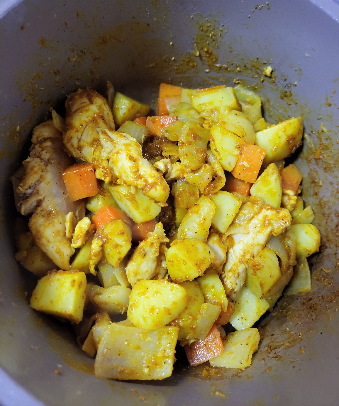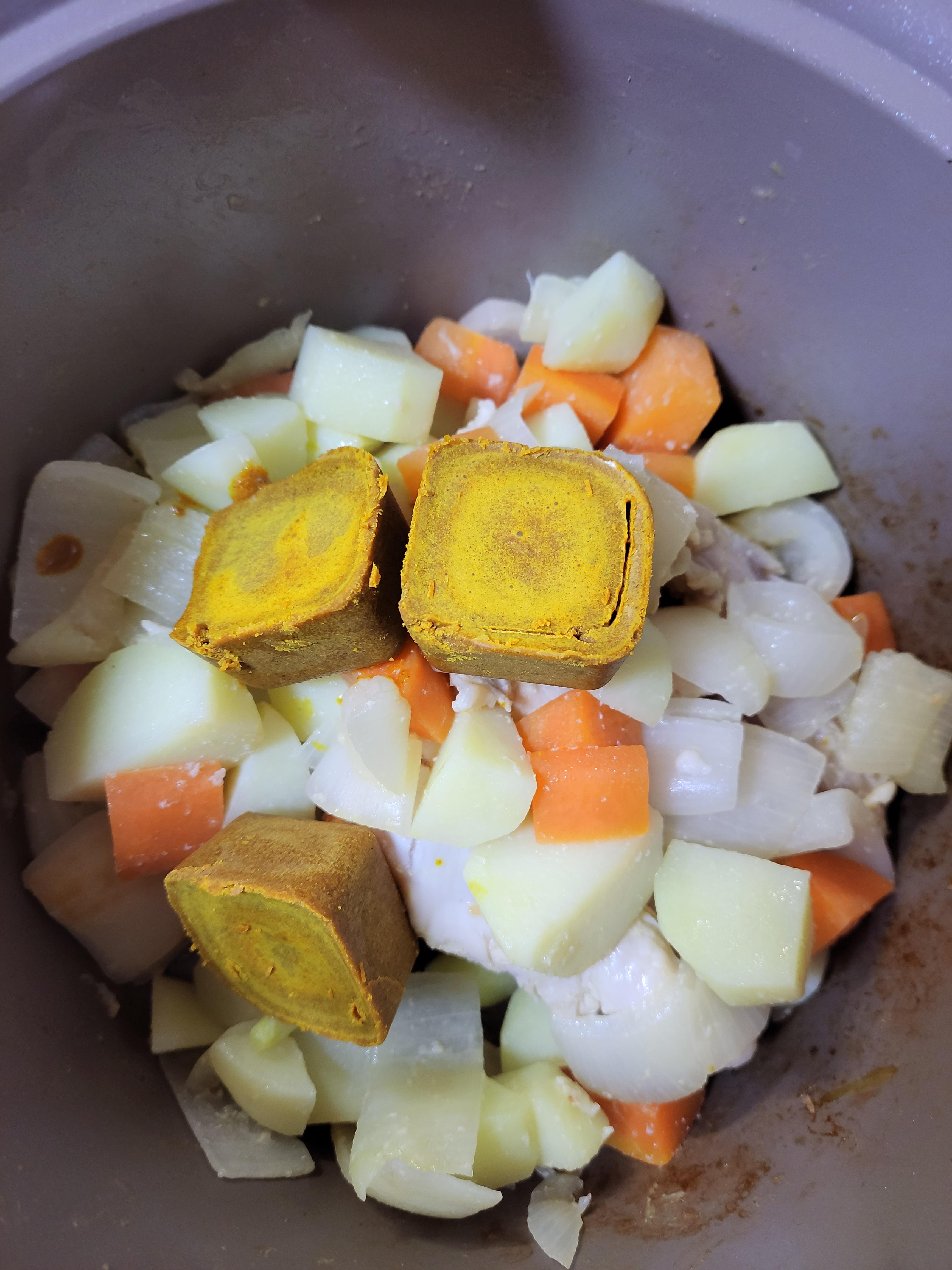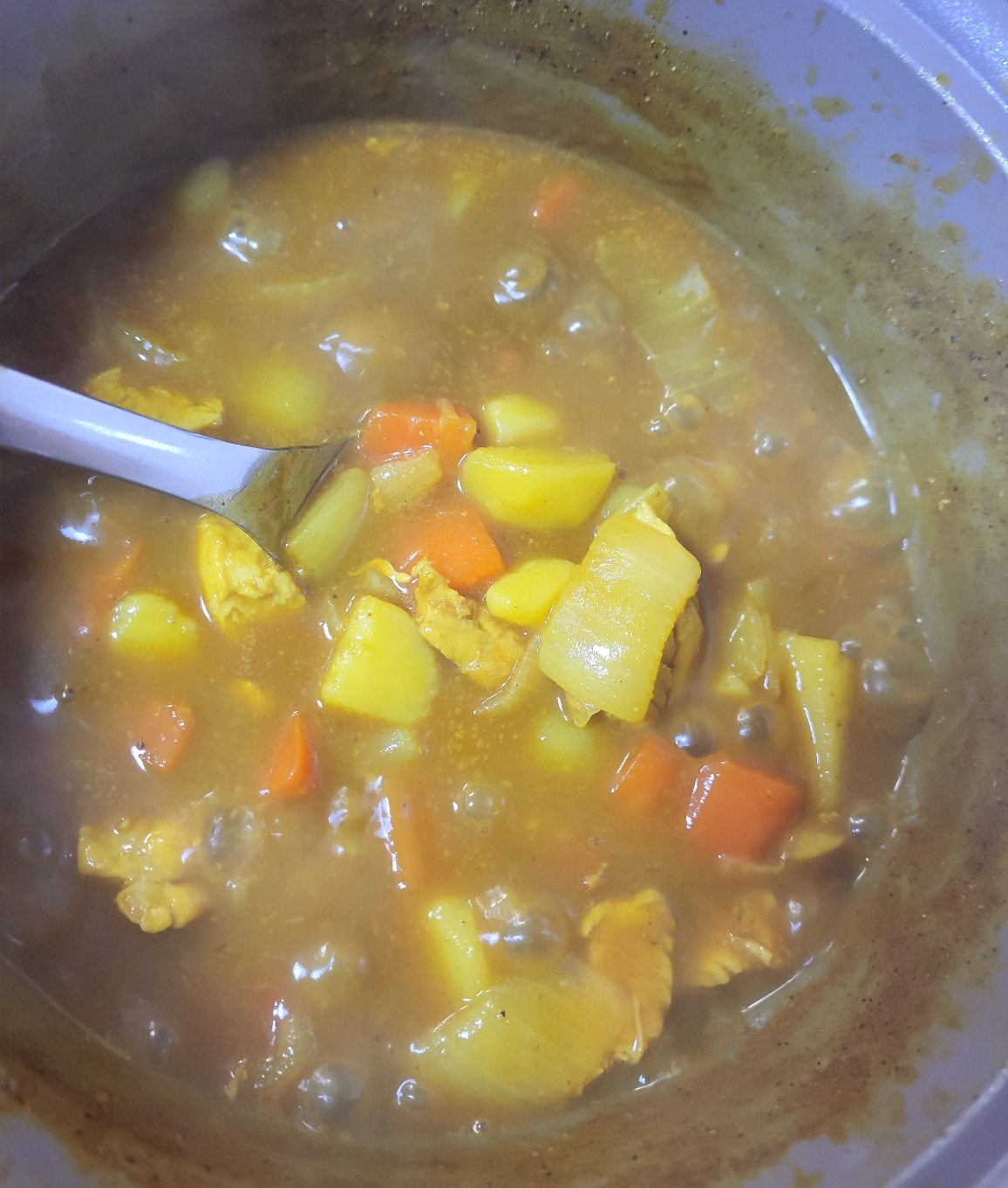 야채와 닭안심 볶다가 큐브형 백세카레 고형을 3알 넣어줬어요~