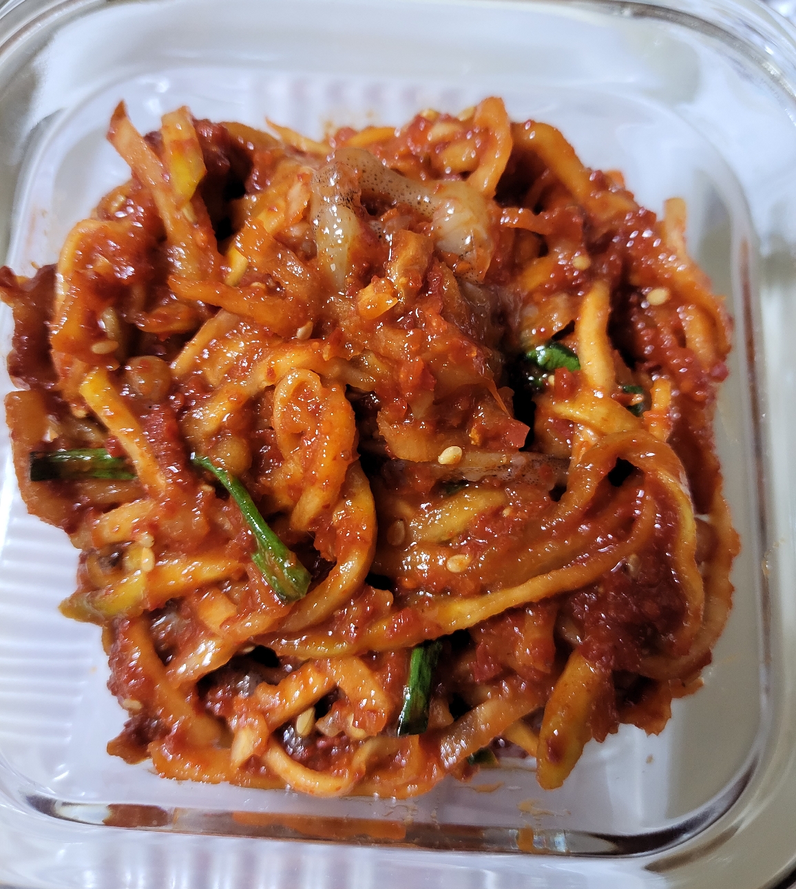 생 오징어와 무채를 절였다가 고춧가루 마늘등 양념에 버무린 오징어식해.